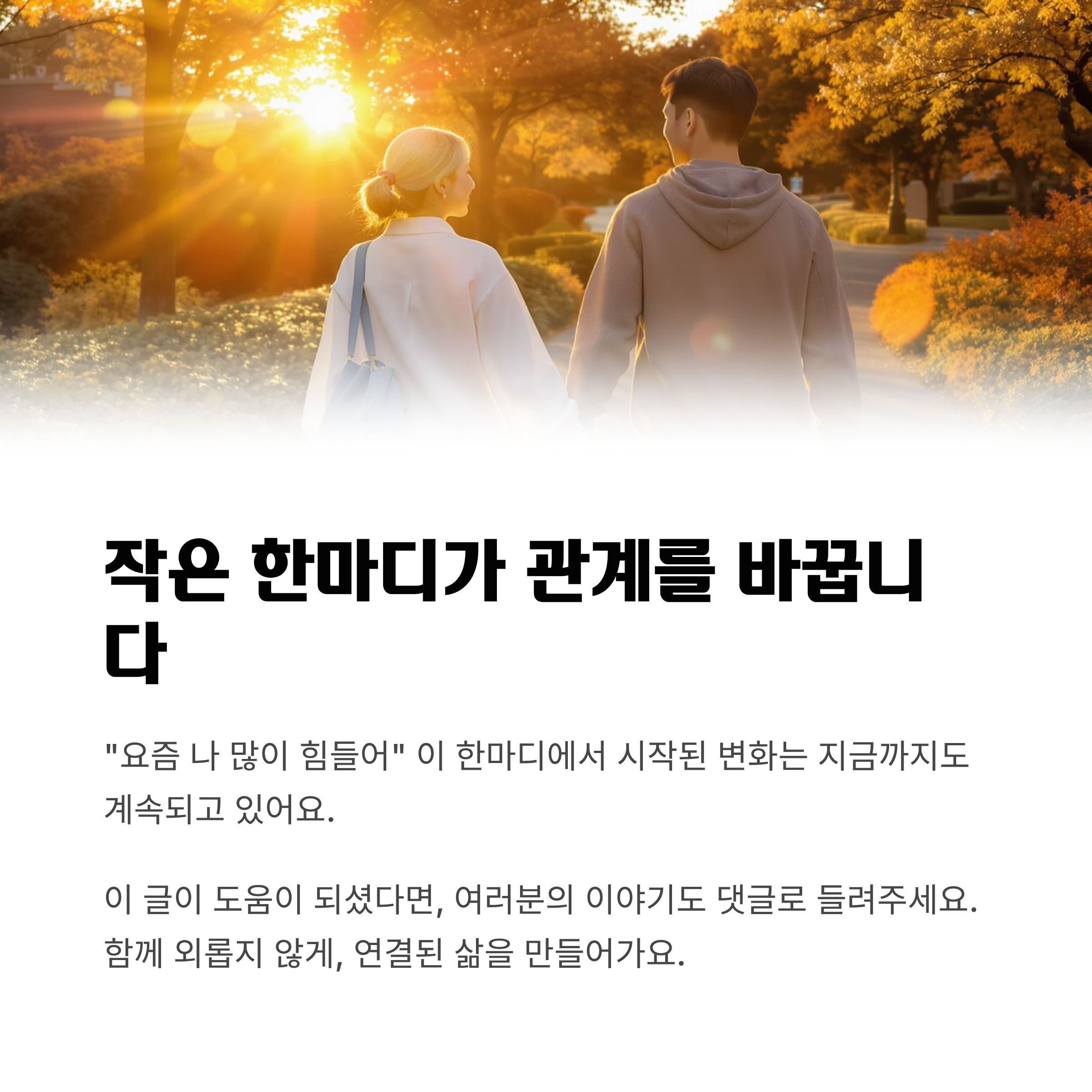 대화는 내용보다 ‘느낌’이 중요합니다. 말하는 방식, 말투, 타이밍을 조절해보세요. 때로는 말하지 않고 곁에 있는 것이 최고의 대화가 되기도 합니다.