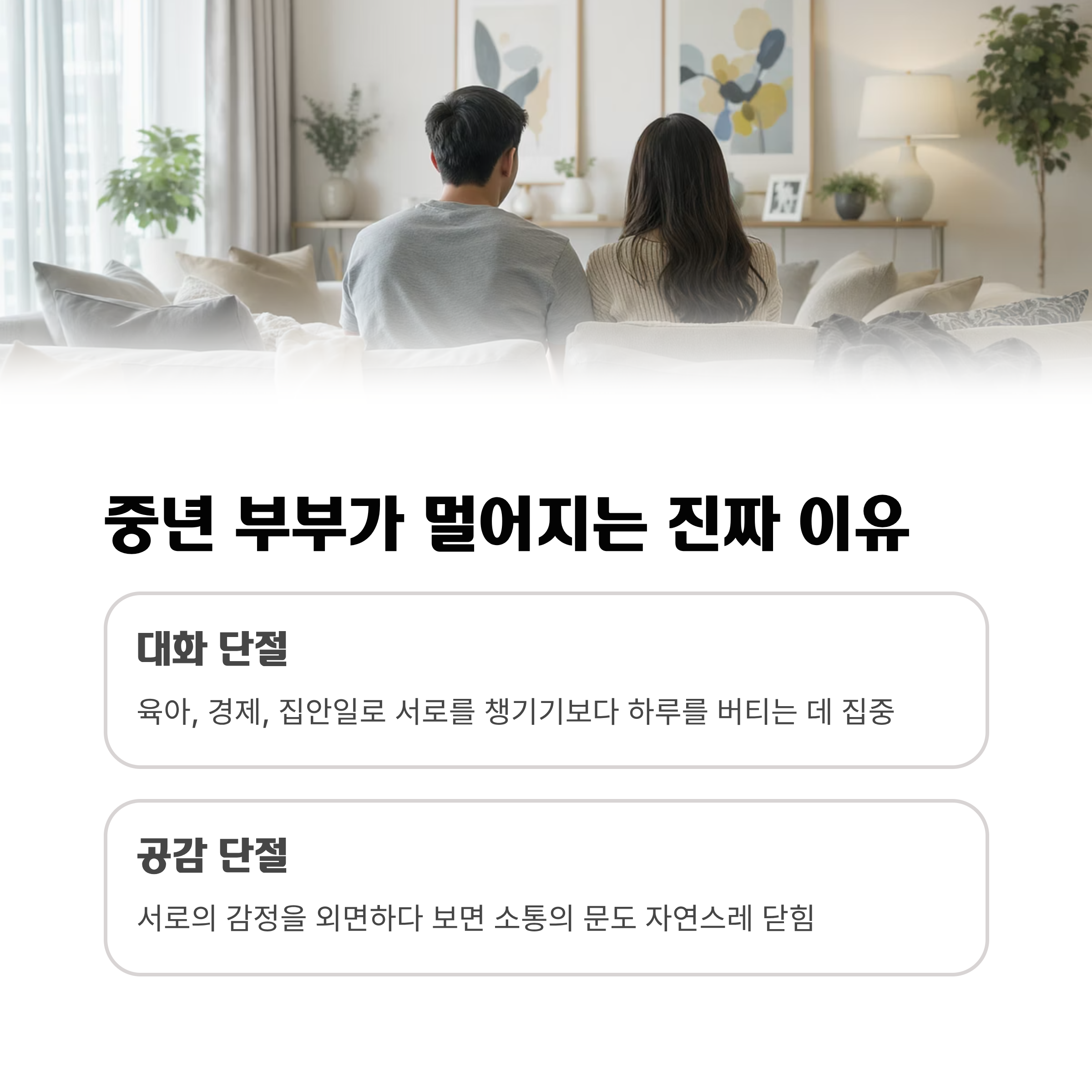 결혼 10년, 20년이 지나면 자연스럽게 남편과의 대화는 줄어듭니다. 육아, 경제, 집안일로 서로를 챙기기보다는 하루를 버티는 데 집중하게 되죠. 그렇게 습관처럼 대화를 줄이다 보면, 어느새 같은 집에 살아도 마음은 멀어져 있습니다. ‘더 이상 할 말이 없다’는 말은 사실 관계의 끝이 아니라, ‘같이 하고 싶은 대화를 잊어버린 상태’일 수 있습니다. 중년 부부가 멀어지는 가장 큰 이유는 대화의 단절이 아니라 공감의 단절입니다. 서로의 감정을 외면하다 보면 소통의 문도 자연스레 닫히게 되는 거죠.
