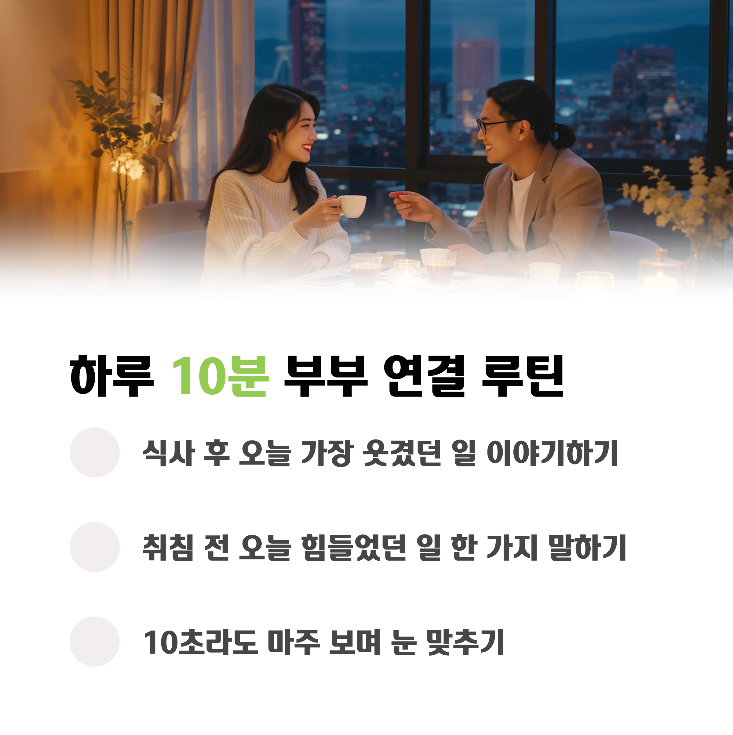 바쁜 일상 속에서도 하루 10분, 부부가 연결되는 시간을 만드는 것은 관계 회복의 핵심입니다. 아주 짧은 대화라도 매일 반복되면 신뢰와 친밀감이 쌓입니다. 아래 루틴을 참고해보세요.
