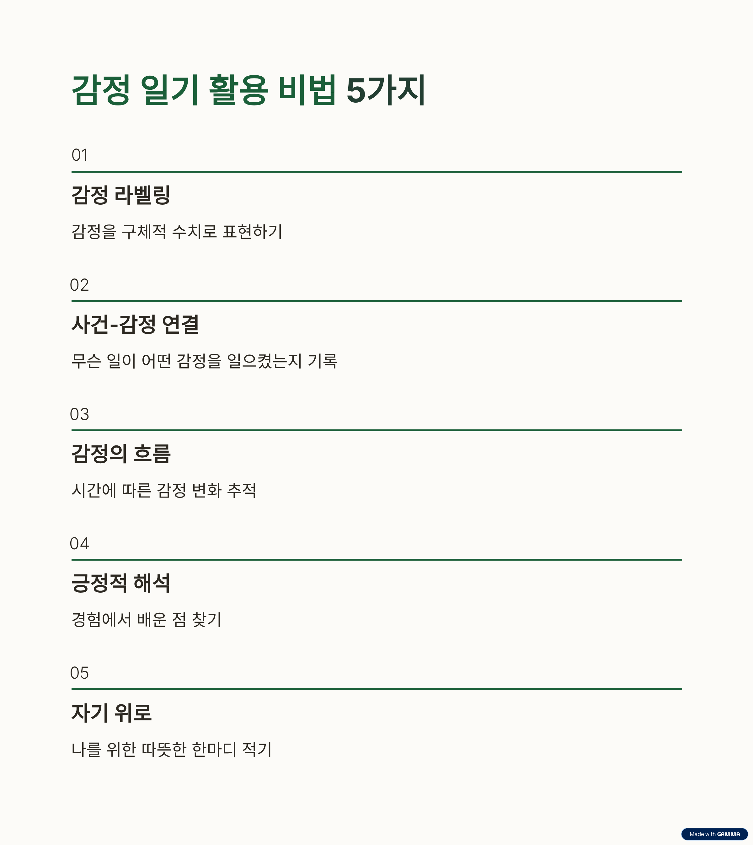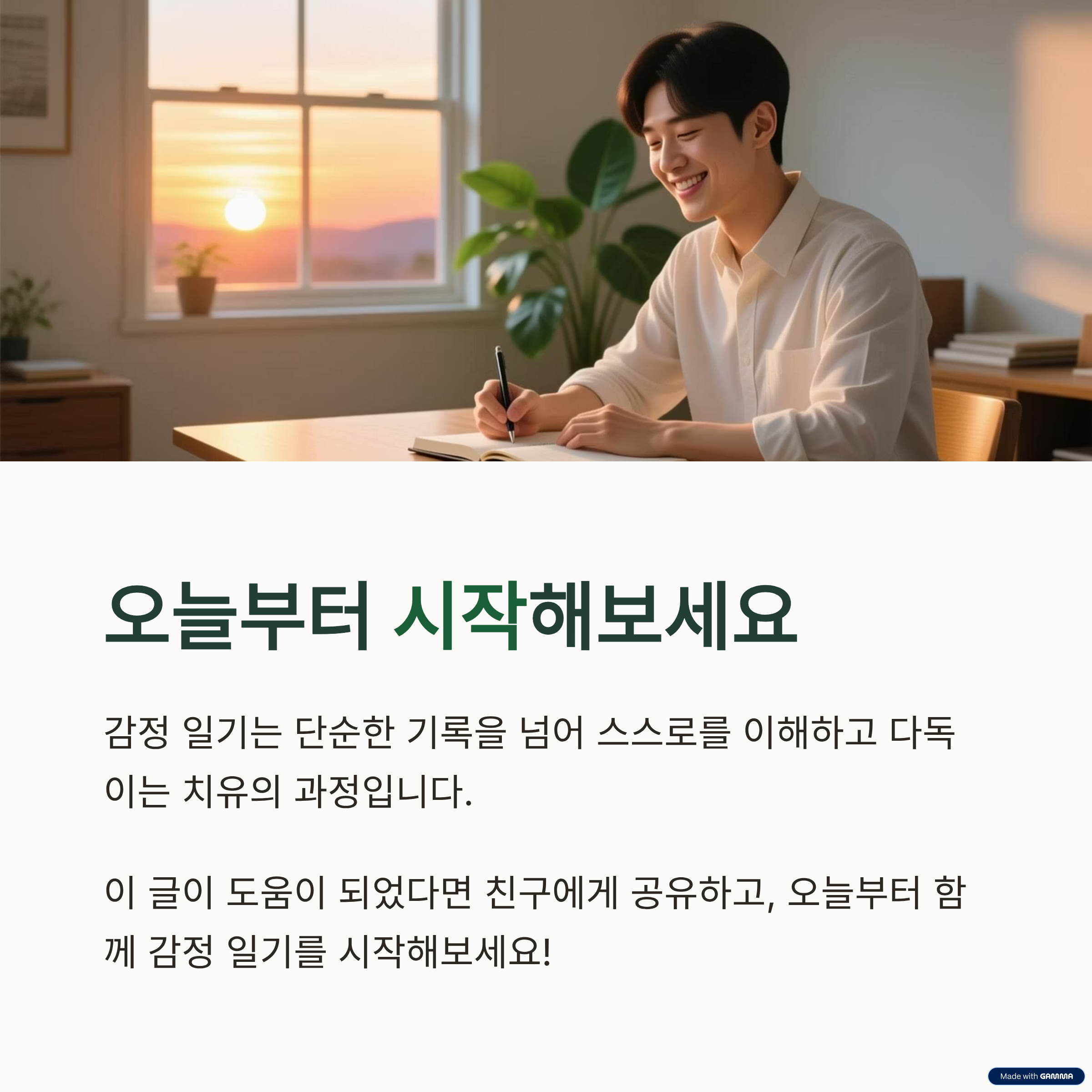 이 다섯 가지 비법은 단순히 감정을 토로하는 것을 넘어, 감정을 성장의 자원으로 바꾸는 힘을 줍니다. 매일 조금씩 실천하다 보면 감정을 더 건강하게 다루는 자신을 발견하게 될 것입니다.