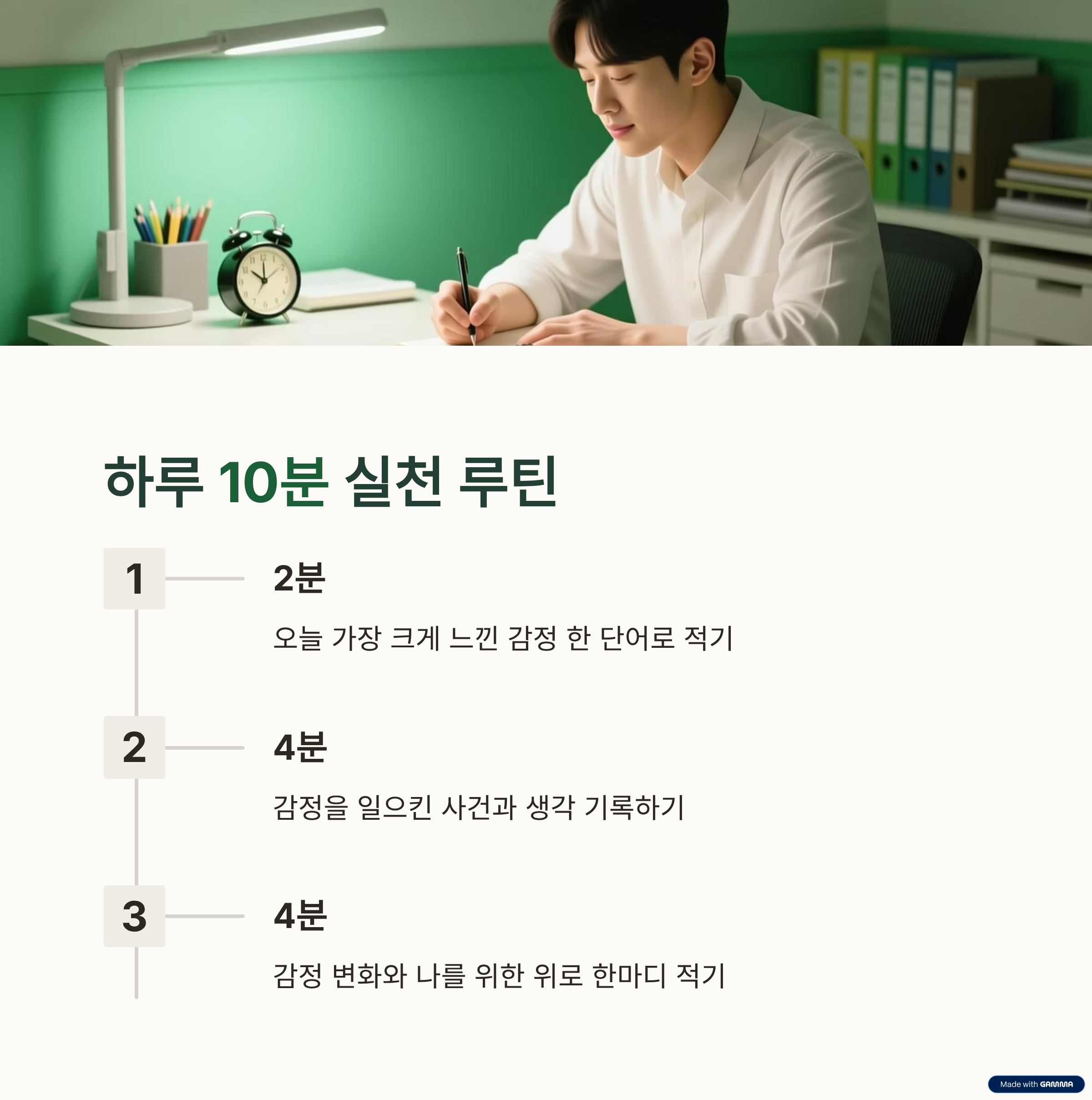 | 4분 | 감정이 지금 어떻게 달라졌는지, 나를 위한 위로 한마디 적기 |
