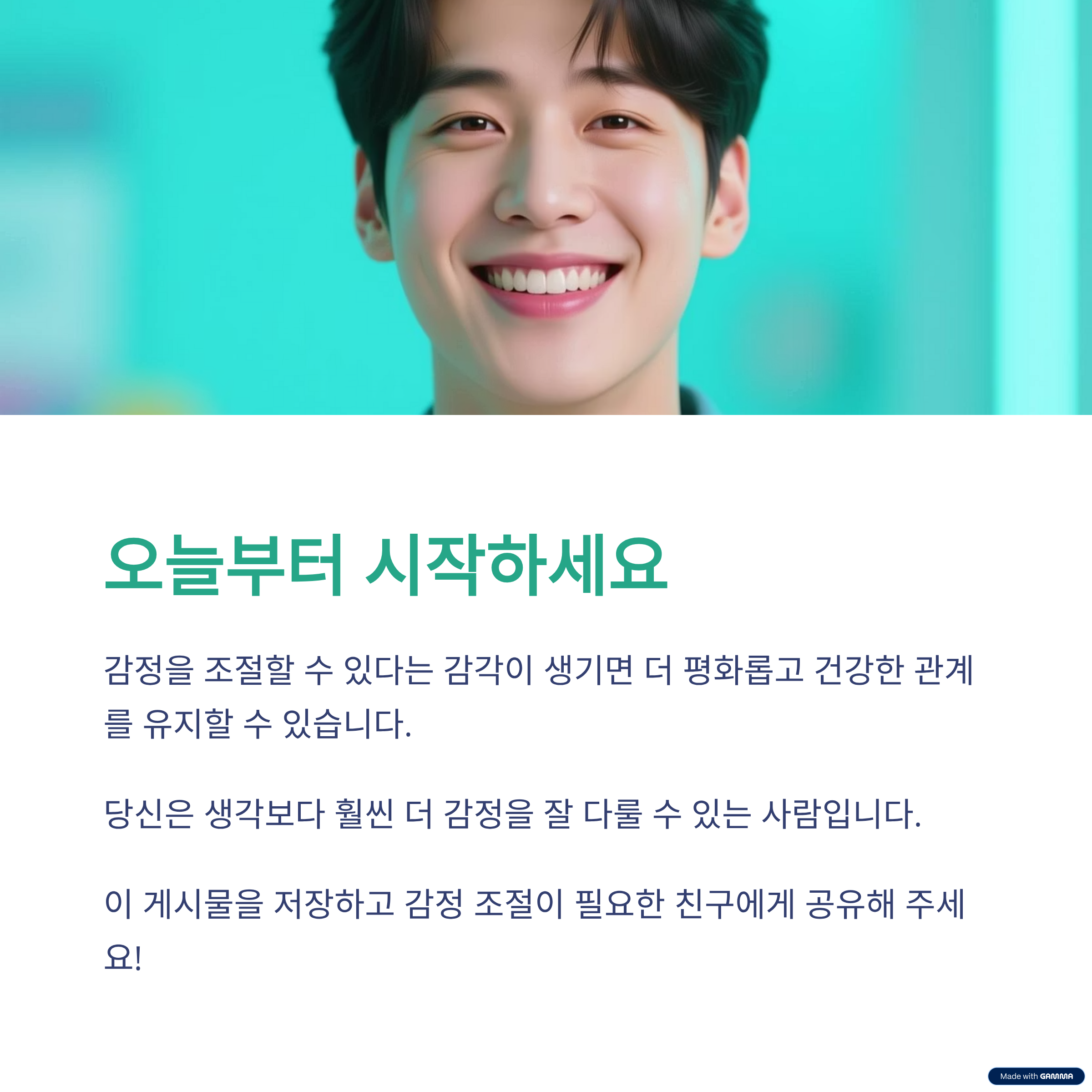 감정은 삶을 풍요롭게도, 때론 혼란스럽게도 만들죠. 하지만 감정을 '조절할 수 있다'는 감각이 생기면 일상에서 훨씬 더 평화롭고 건강한 관계를 유지할 수 있습니다. 마인드풀니스 훈련은 복잡한 이론이 아닌, 매일의 짧은 실천으로 내면을 바꿀 수 있는 강력한 방법입니다. 오늘부터 나의 감정을 인식하고 수용하는 작은 훈련을 시작해 보세요. 당신은 생각보다 훨씬 더 감정을 잘 다룰 수 있는 사람입니다.