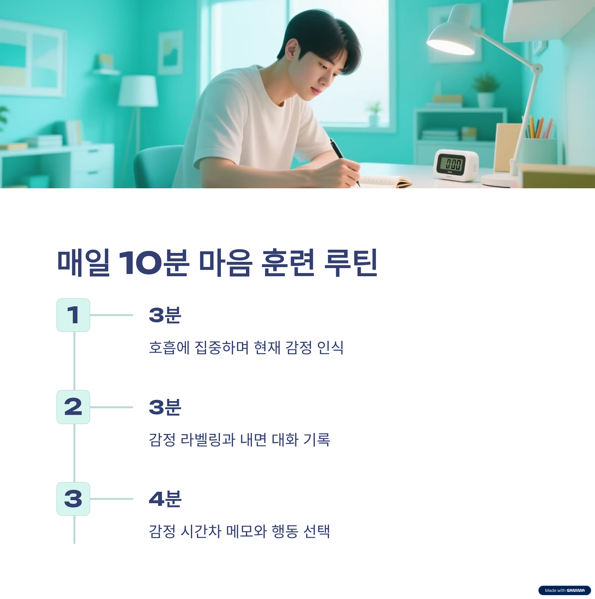 감정 조절은 하루아침에 되는 일이 아닙니다. 하지만 매일 단 10분이라도 자신에게 집중하는 시간을 가지면 마음의 흐름이 달라집니다. 아래 루틴을 매일 실천해보세요.