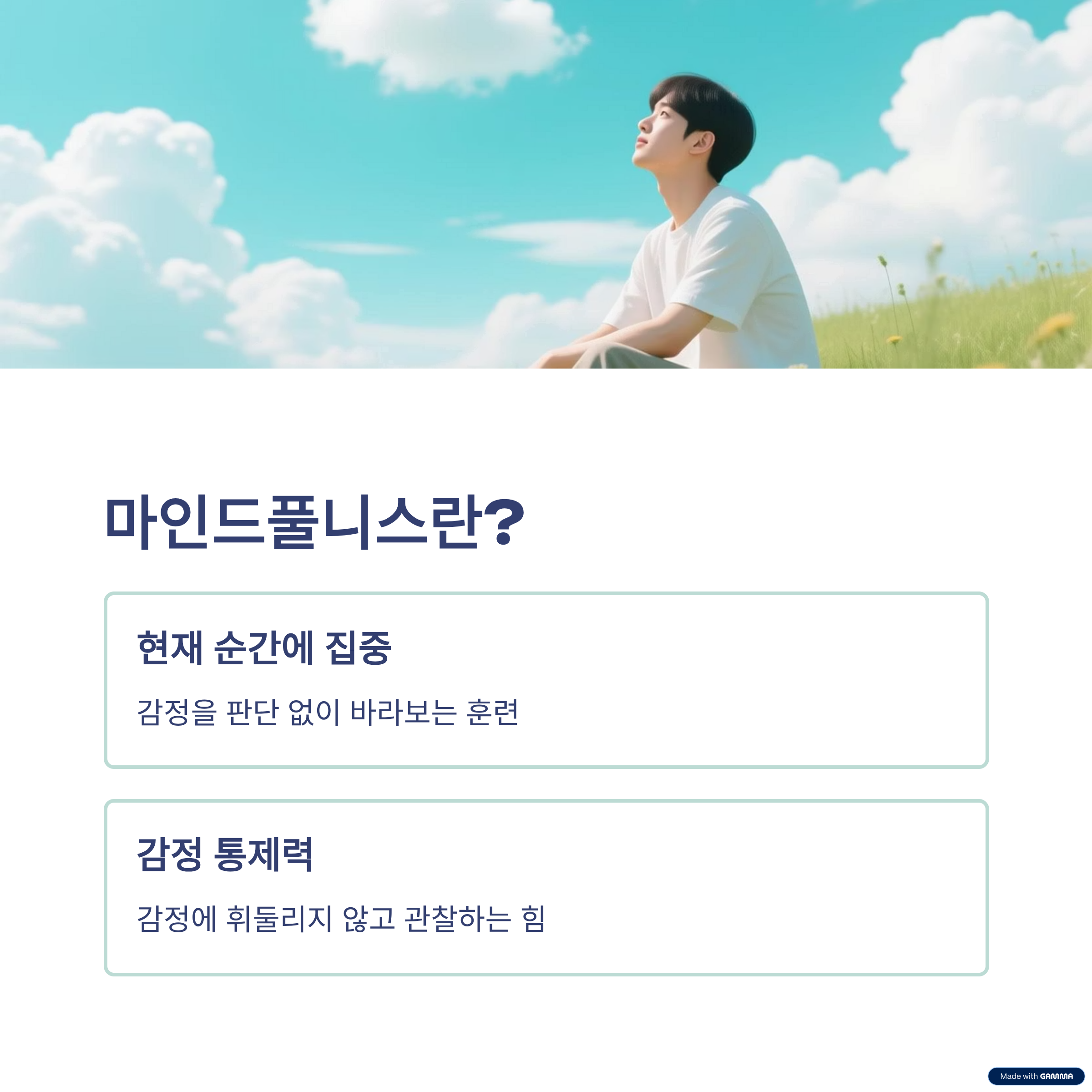 감정은 우리의 삶에서 필수적인 신호입니다. 하지만 이 감정이 나도 모르게 폭발하거나, 오래도록 지속되면 관계에도, 건강에도 영향을 미치죠. 마인드풀니스는 현재 순간에 주의를 집중하고 있는 그대로의 감정과 생각을 판단 없이 바라보는 훈련입니다. 즉, 감정에 휘둘리지 않고 관찰하고 수용하는 힘을 기르는 방법입니다.