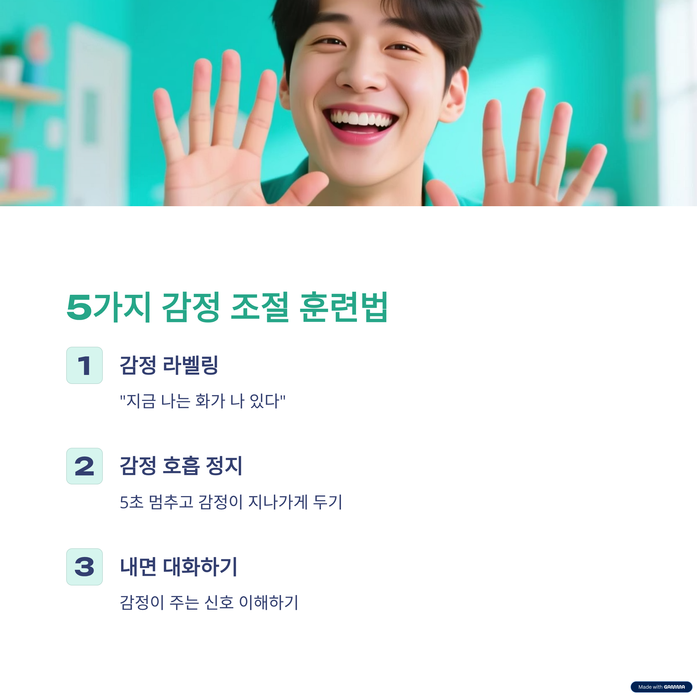| 1. 감정 라벨링 | 느껴지는 감정에 이름을 붙입니다. 예: “지금 나는 화가 나 있다.” |