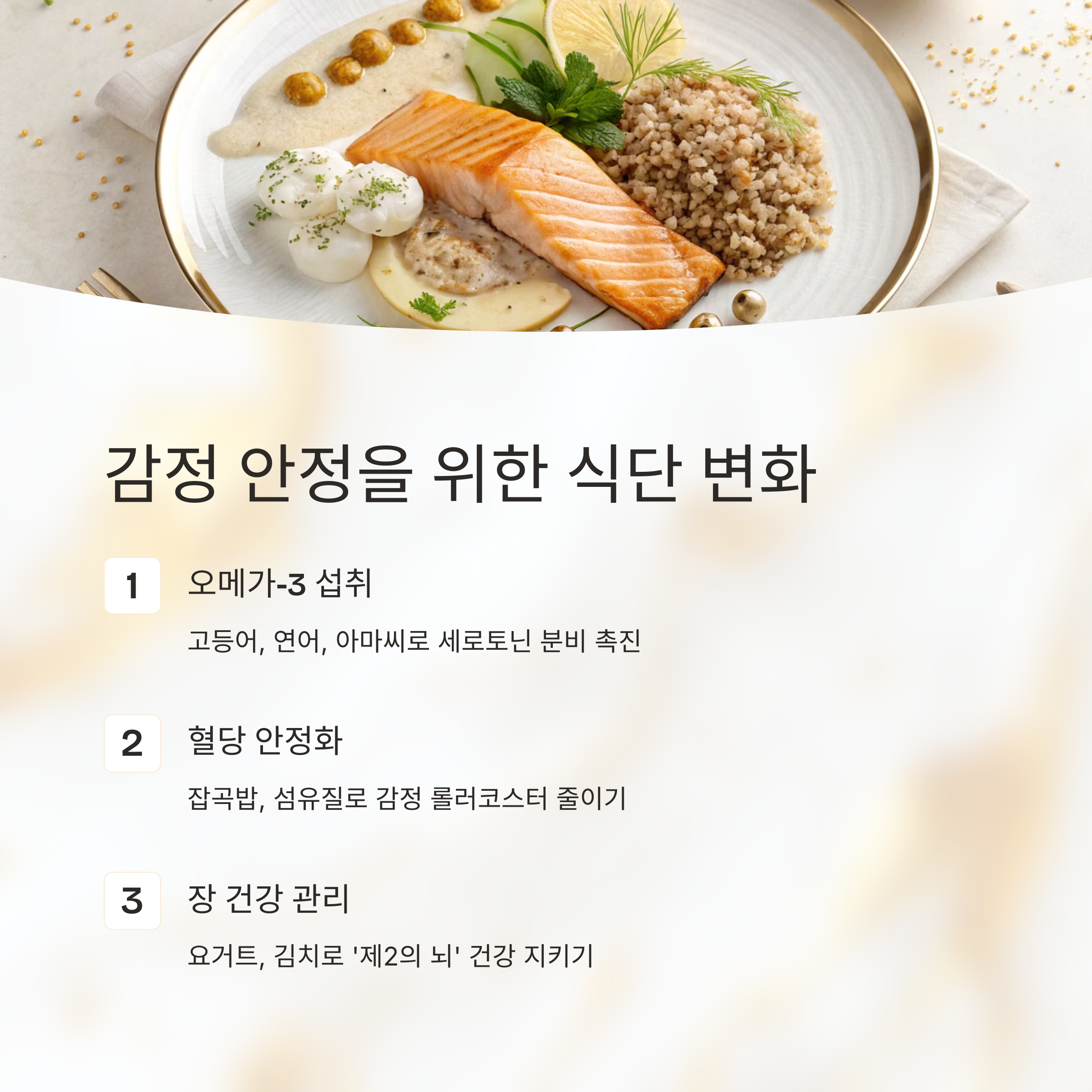 혈당이 안정되면 뇌가 더 차분하게 기능하고, 감정도 덜 예민해집니다. 따라서 식사 시에는 복합 탄수화물, 섬유질, 단백질을 함께 섭취하는 것이 좋습니다. 대표적으로 잡곡밥, 두부, 나물류 등이 있죠. 이처럼 혈당을 천천히 올리는 음식을 먹는 습관만으로도 감정기복이 훨씬 줄어들 수 있습니다.