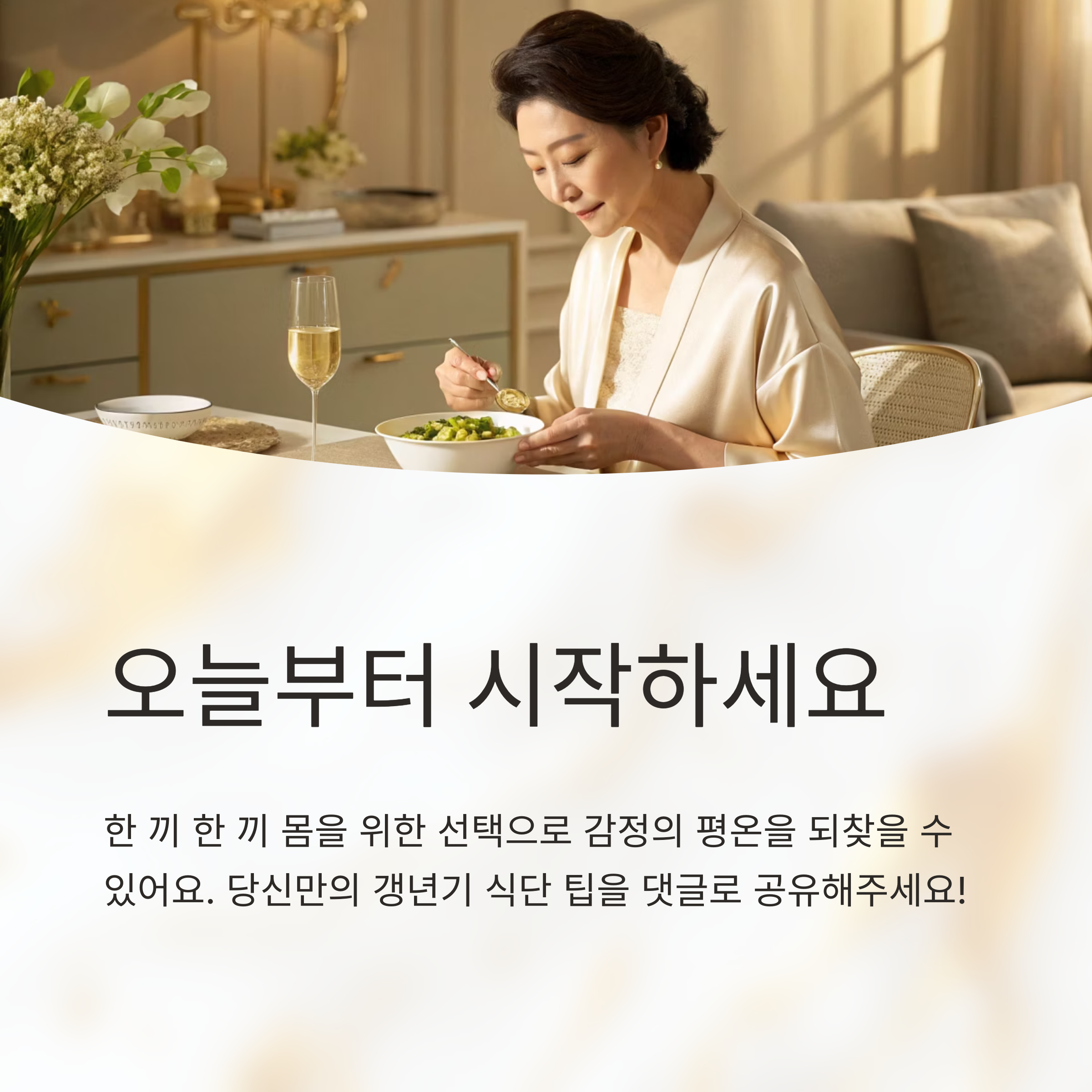 저도 갱년기를 지나며 마음이 부서질 듯한 순간들이 자주 찾아왔습니다. 그런데 식단을 바꾸고 나서부터는 그 감정의 폭이 조금씩 좁아지기 시작했어요. 완벽하게 조절되진 않지만, 한 끼 한 끼 내 몸을 위한 선택을 하면서 삶이 더 안정적으로 느껴지더라고요. 갱년기의 감정기복은 혼자만의 문제가 아니에요. 오늘 소개한 식단 팁들이 여러분의 일상에도 작은 희망이 되길 바랍니다. 지금 이 순간부터, 식탁 위 작은 변화로 감정의 평온을 되찾아보세요.