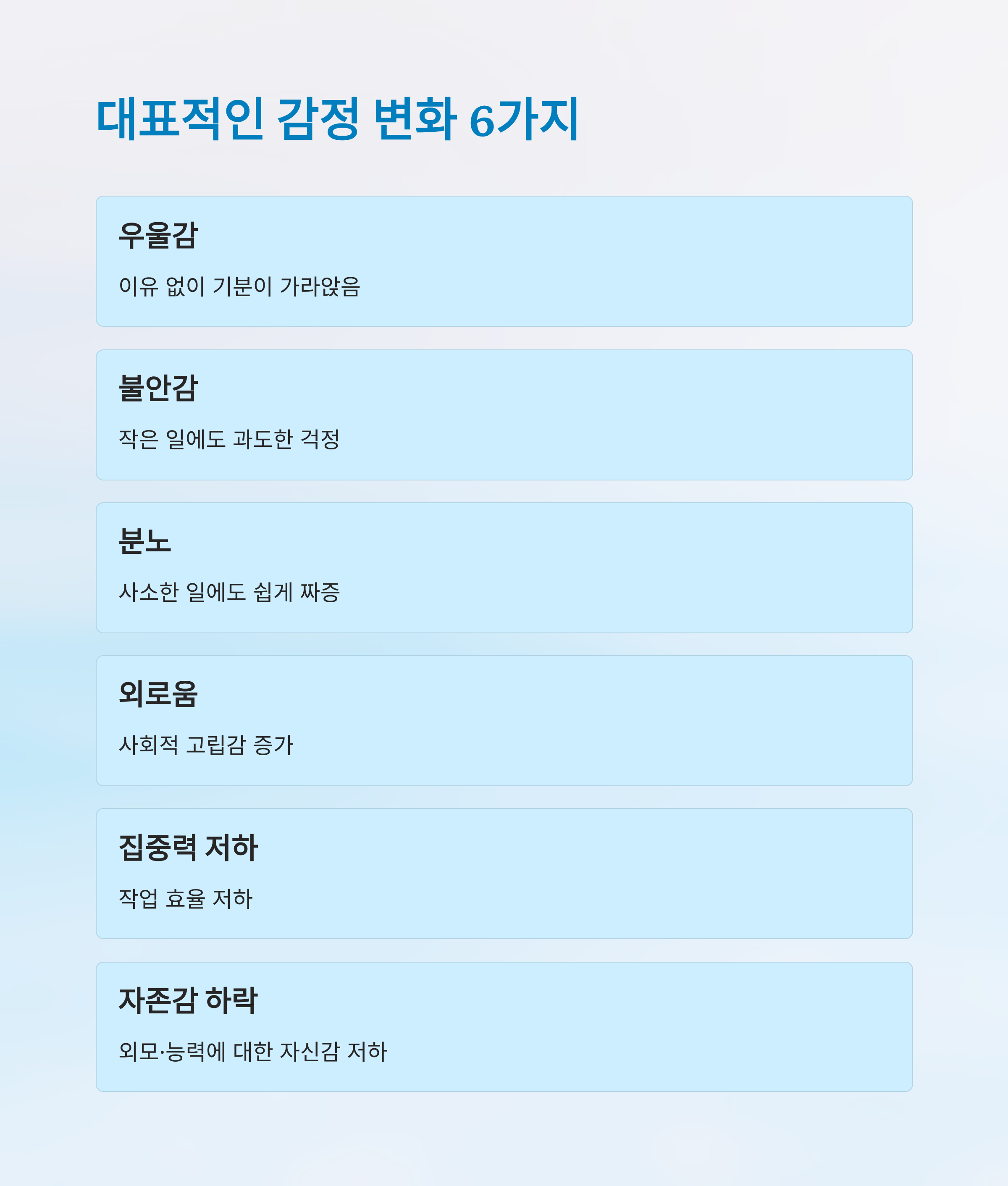 갱년기에는 특정 패턴의 감정 변화가 반복적으로 나타납니다. 아래 표는 많은 분들이 경험하는 6가지 주요 감정 변화를 정리한 것입니다.