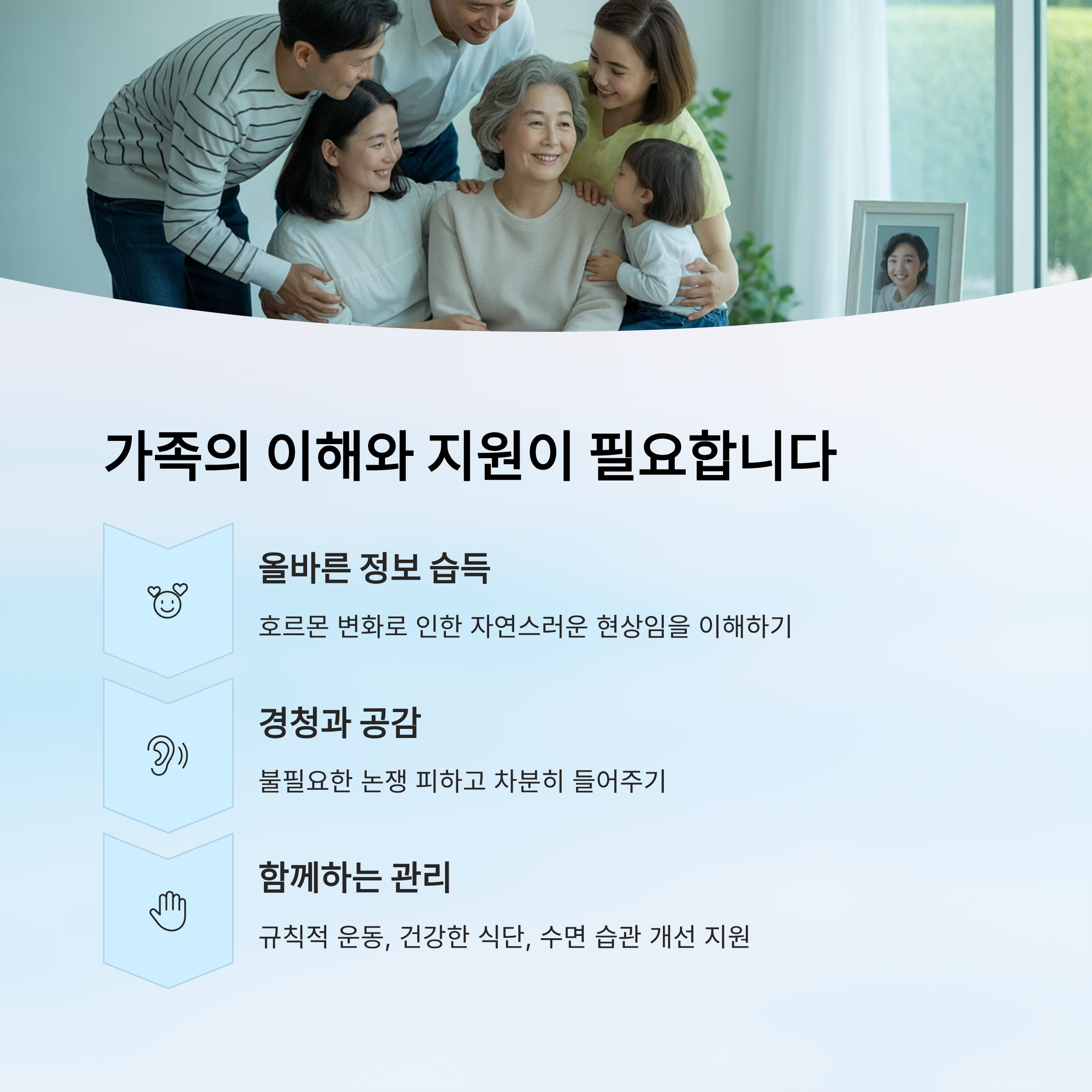 갱년기 감정 변화는 피할 수 없는 인생의 한 과정이지만, 이를 어떻게 받아들이고 관리하느냐에 따라 그 경험의 질은 달라집니다. 가장 중요한 것은 혼자가 아니라는 사실을 기억하는 것입니다. 가족의 이해와 지지, 그리고 스스로를 돌보려는 노력이 함께할 때, 갱년기의 파도도 한층 잔잔해집니다. 오늘부터라도 가족과 솔직하게 대화하고, 작은 생활습관 변화부터 실천해 보세요. 여러분의 중년이 조금 더 따뜻하고 안정되길 진심으로 바랍니다.