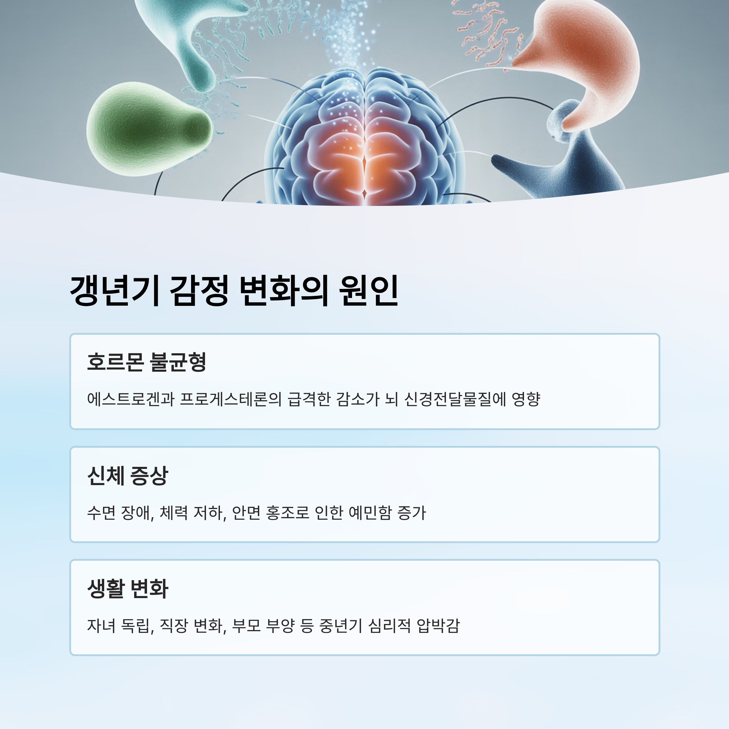 갱년기 감정 변화의 가장 큰 원인은 호르몬 불균형입니다. 특히 에스트로겐과 프로게스테론의 급격한 감소는 뇌 속 신경전달물질에도 영향을 주어 기분 변화를 일으킵니다. 또한 수면 장애, 체력 저하, 안면 홍조 같은 신체 증상과 맞물려 예민함이 커지고, 사소한 일에도 과민 반응을 하게 됩니다. 여기에 중년의 다양한 생활 변화—자녀 독립, 직장 변화, 부모 부양—까지 겹치면 심리적 압박감은 배가됩니다. 이런 복합적인 요인들이 갱년기 감정 변화를 만드는 것이죠.