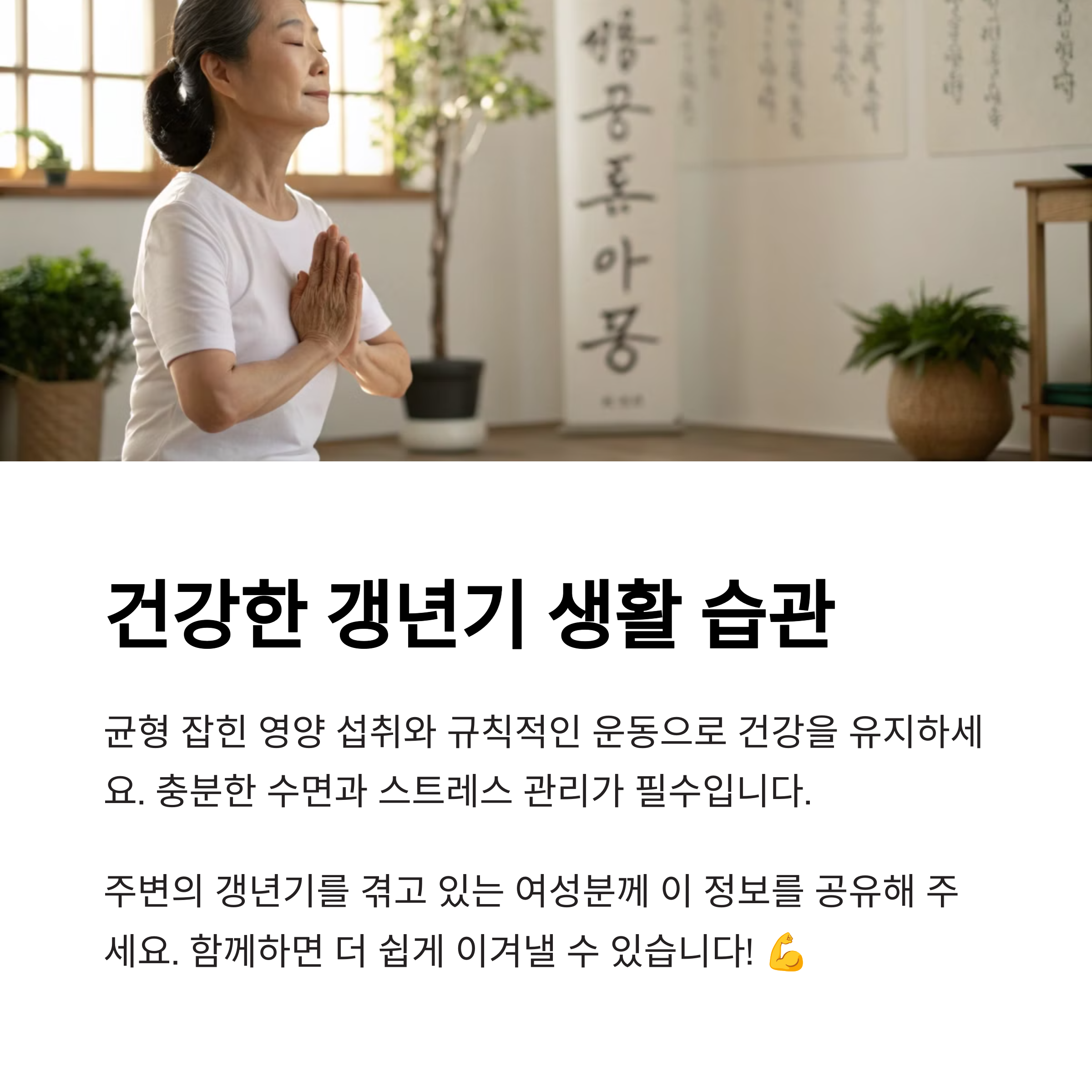 오늘 제가 전해드린 갱년기와 폐경기 자연관리법, 어떠셨나요? 완벽하진 않아도 작은 실천 하나하나가 우리 몸에 큰 변화를 가져오더라고요. 저도 하루 10분 루틴부터 시작해 많은 변화를 느꼈답니다. 여러분도 자신만의 리듬을 찾아보세요. 경험을 나누고 싶다면 언제든 댓글로 이야기 나눠요. 우리, 서로의 이야기에 귀 기울여봐요!