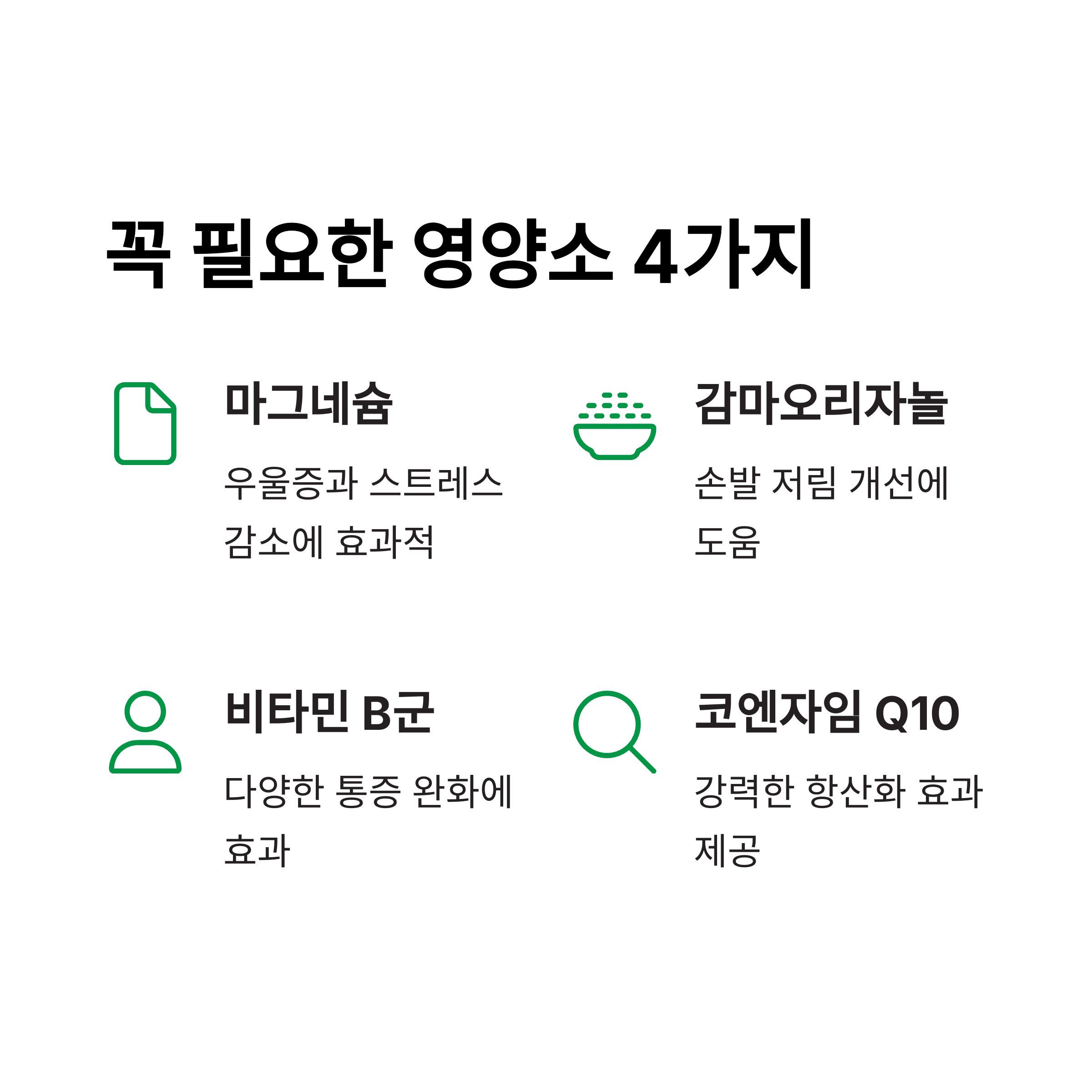 식단에서 충분히 섭취하기 어렵다면, 전문의 상담 후 필요한 영양제를 선택하는 것도 좋은 방법입니다.