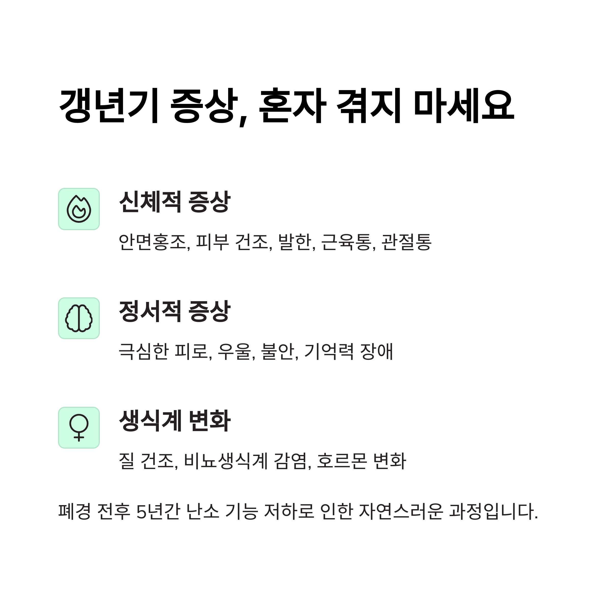 이 시기의 신호를 민감하게 캐치하는 것이 갱년기 관리를 시작하는 첫걸음이에요.