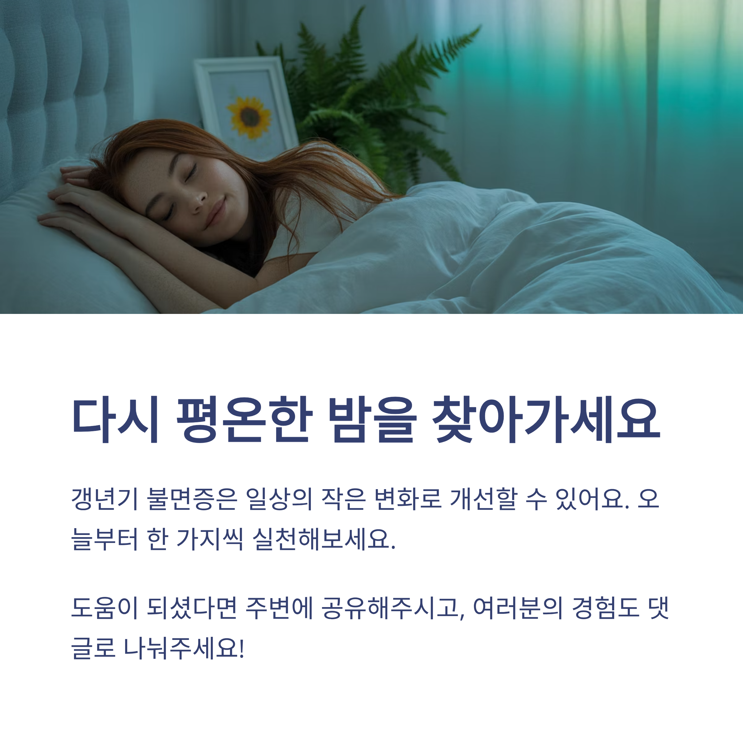 갱년기 수면장애와 불면증은 단순한 밤의 문제가 아닙니다. 하루의 리듬, 감정의 안정, 삶의 질 전체에 깊은 영향을 미치죠. 하지만 우리가 일상에서 실천할 수 있는 작은 변화들이 모이면, 다시 평온한 밤을 맞이할 수 있습니다. 오늘 소개한 7가지 실천 팁을 통해 조금이라도 편안한 잠자리를 찾으시길 바랍니다. 나의 리듬을 다시 되찾는 그날까지, 함께 응원합니다. 도움이 되셨다면 주변에 공유해주시고, 본인의 경험도 나눠주세요. 함께하는 이야기가 큰 위로가 되니까요.