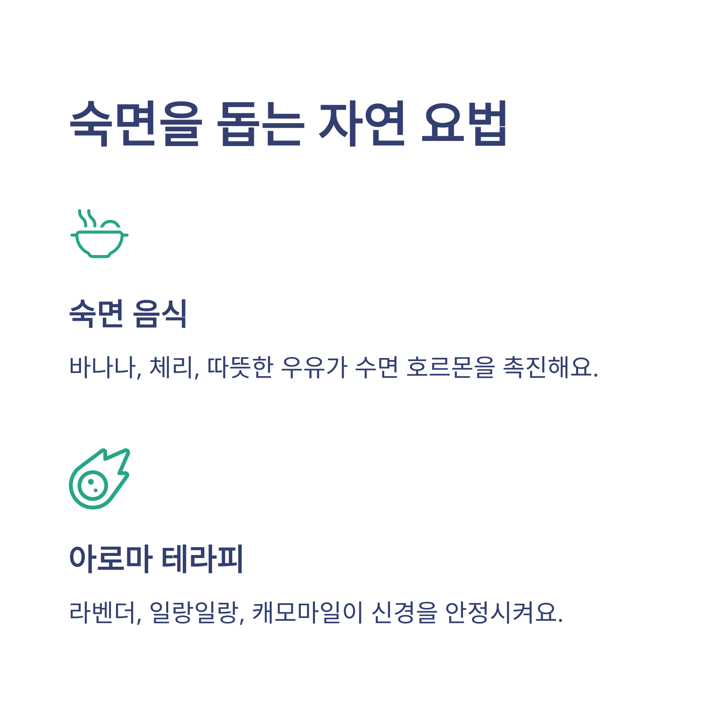 아로마 테라피, 족욕, 저녁 스트레칭, 일정한 수면 루틴이 대표적인 자연요법입니다.