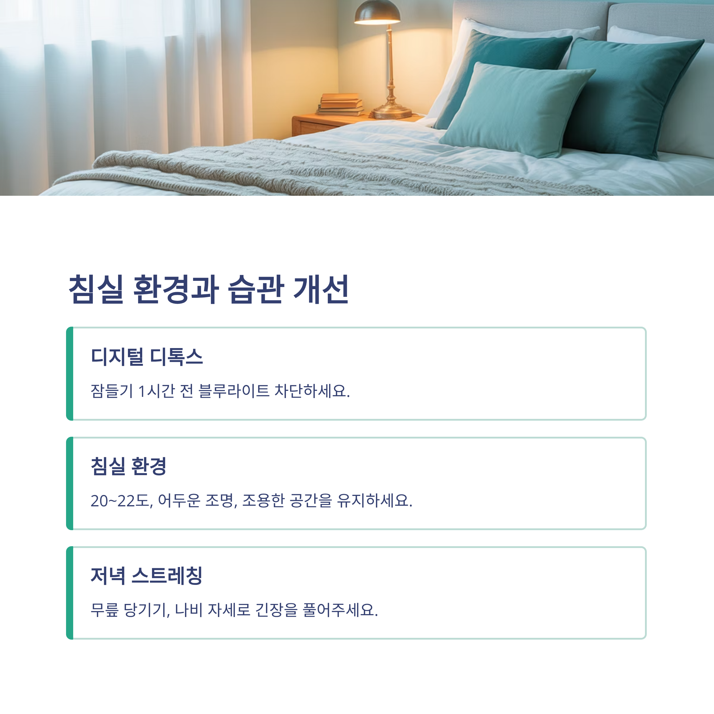 숙면을 위해서는 침실 환경도 매우 중요합니다. 조명의 색, 온도, 침구 상태 하나하나가 잠의 질에 큰 영향을 줍니다. 특히 갱년기에는 열감이나 식은땀으로 인해 자주 깨기 쉬운데요, 시원하고 어두운 환경을 유지하는 것이 도움이 됩니다. 아래는 추천하는 침실 세팅 항목을 정리한 표입니다.
