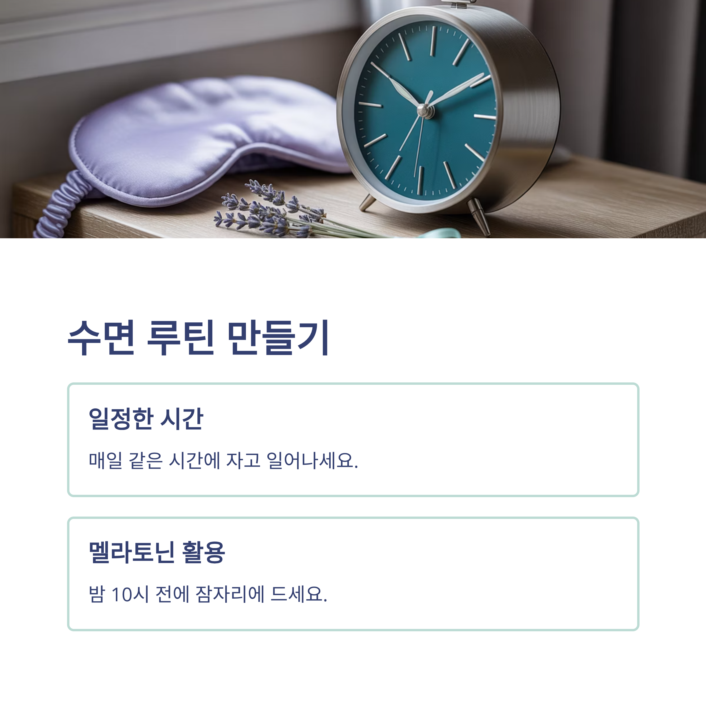 갱년기 수면장애를 겪는 분들에게 가장 중요한 것은 '일관성'입니다. 잠드는 시간과 일어나는 시간을 일정하게 유지하는 것만으로도 우리 몸의 생체리듬이 안정되어 수면 질이 향상될 수 있어요. 특히 밤 10시 이후는 멜라토닌 분비가 활발해지는 시간대이기 때문에, 그 전에 잠자리에 드는 습관을 들이는 것이 좋습니다. 처음에는 조금 힘들 수 있지만, 일정한 수면 루틴은 수면의 질과 양 모두를 개선하는 가장 기본적인 방법입니다.