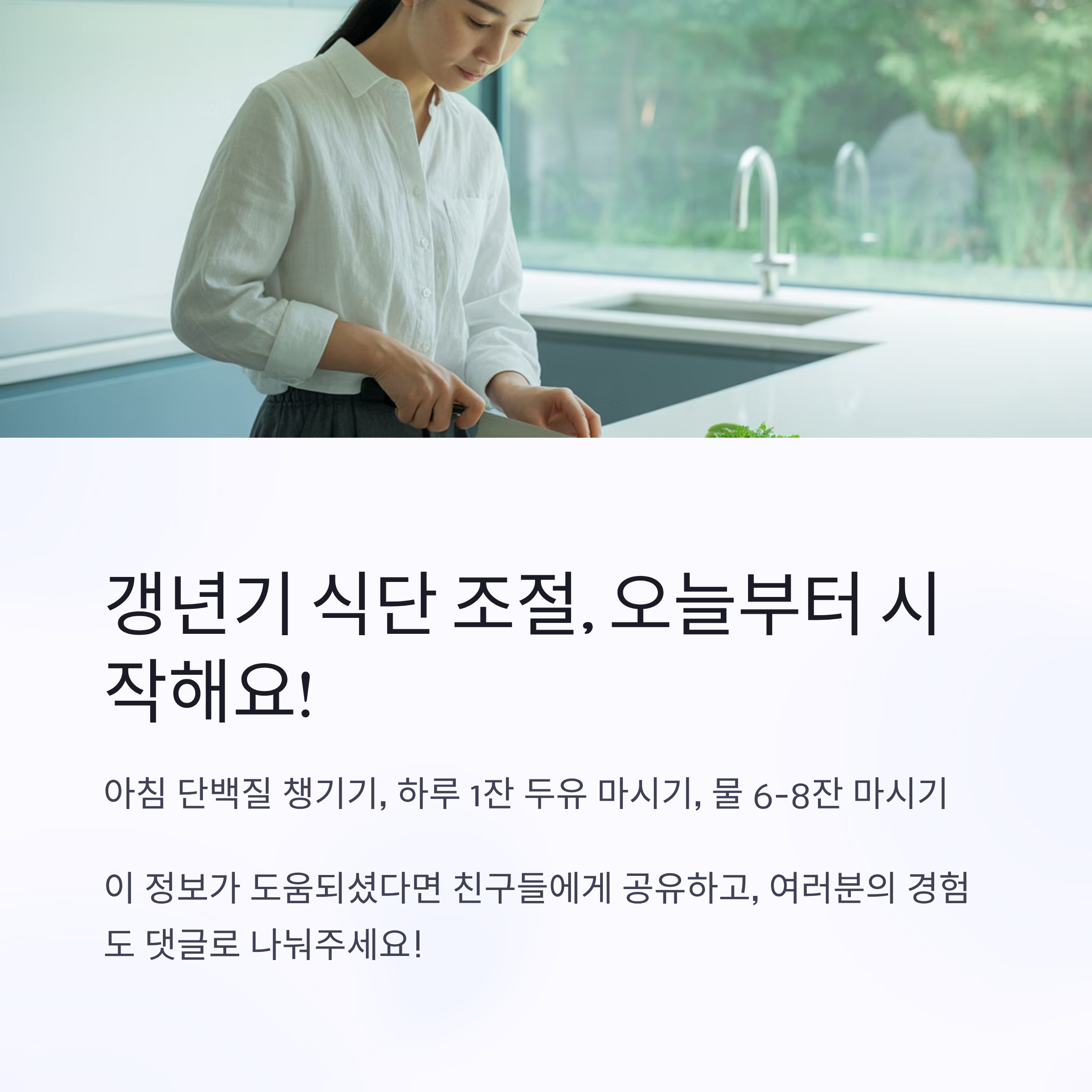 40대 중반부터 증상이 시작되기 전이라도 미리 식단 조절을 통해 준비하는 것이 좋아요. 예방 차원에서도 큰 도움이 됩니다.