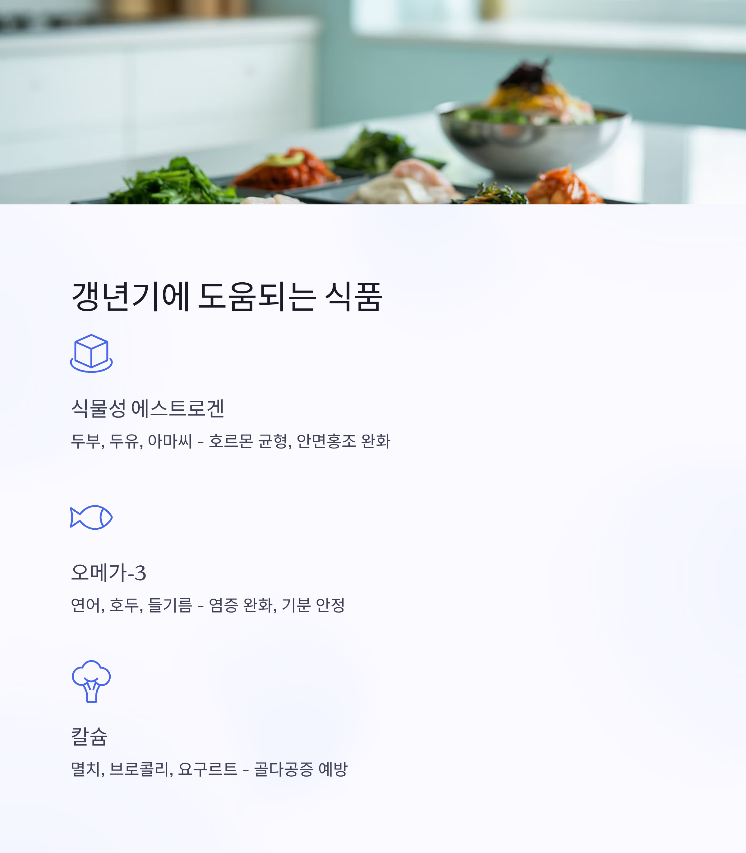 에스트로겐은 음식으로 직접 보충할 수 없지만, 식물성 에스트로겐이나 호르몬 균형에 도움이 되는 영양소는 충분히 섭취할 수 있어요. 다음 표는 갱년기 증상 완화에 도움을 줄 수 있는 주요 식품들을 간단히 정리한 거예요.