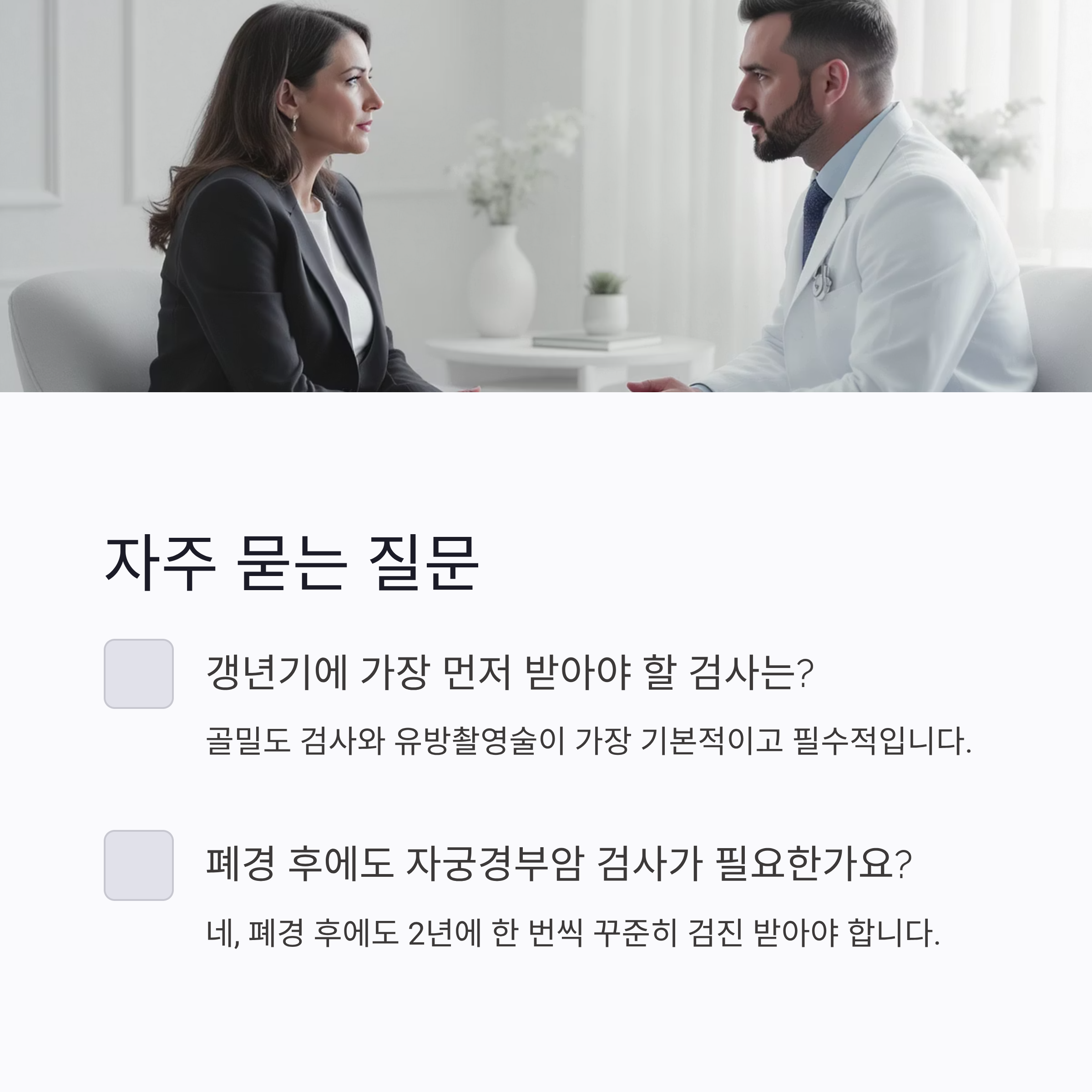 갱년기에는 불안, 우울증 등 정신적 변화가 크기 때문에, 정신건강 검진도 함께 고려하는 것이 매우 중요합니다.