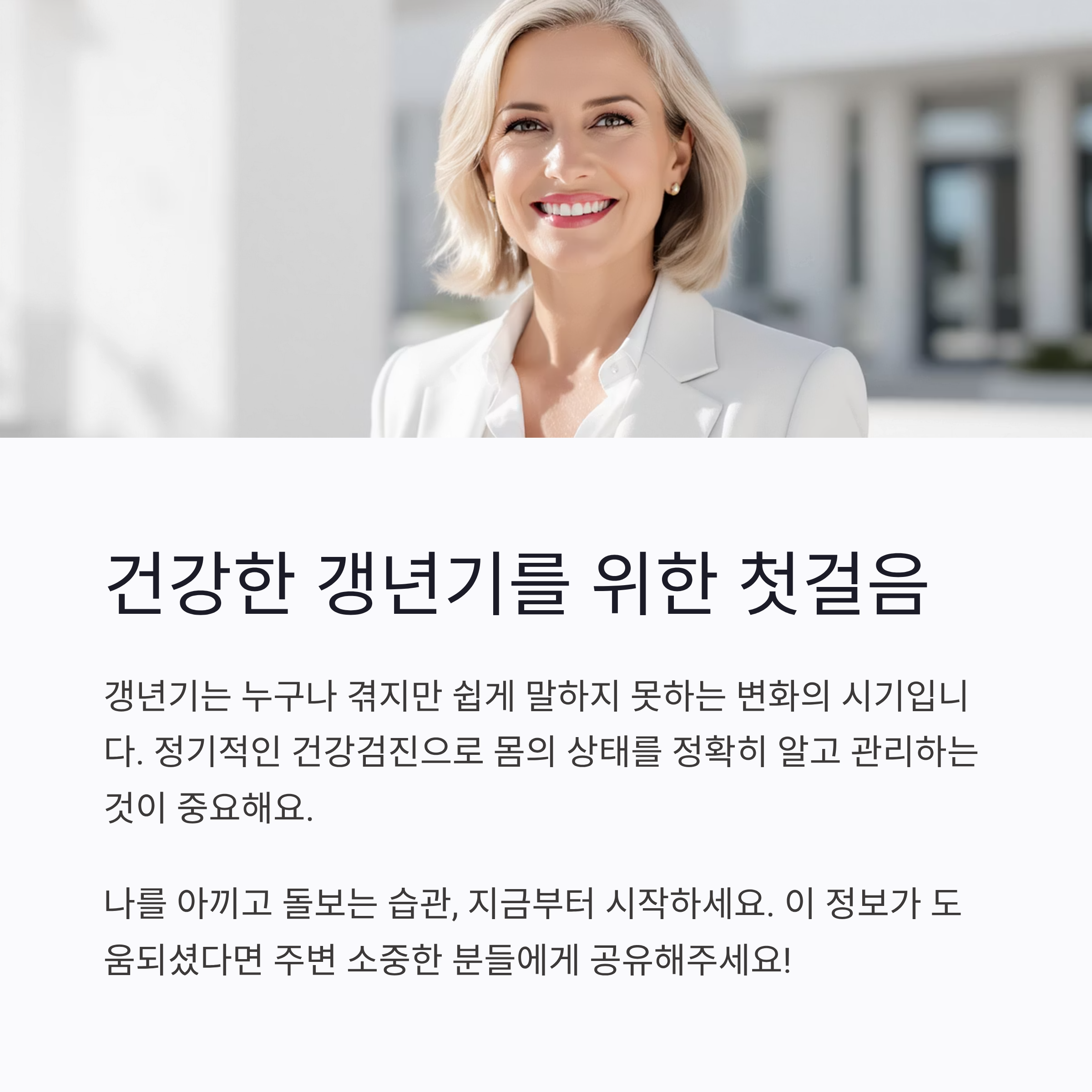 갱년기라는 단어에 담긴 불안과 두려움, 누구나 겪을 수 있지만 누구도 쉽게 말하지 못하는 변화의 시기입니다. 하지만 이 시기를 건강하게 넘기기 위해 우리가 할 수 있는 일은 분명 존재합니다. 오늘 소개한 건강검진 항목들을 하나하나 체크하며 몸의 상태를 정확히 알아가는 것, 그것이 진짜 건강의 시작입니다. 나를 아끼고 돌보는 습관, 지금부터 차근차근 시작해 보세요. 혹시 이 글이 도움이 되셨다면, 댓글로 여러분의 경험도 공유해 주세요. 함께 나누는 이야기가 또 다른 누군가에겐 큰 힘이 될 수 있어요.