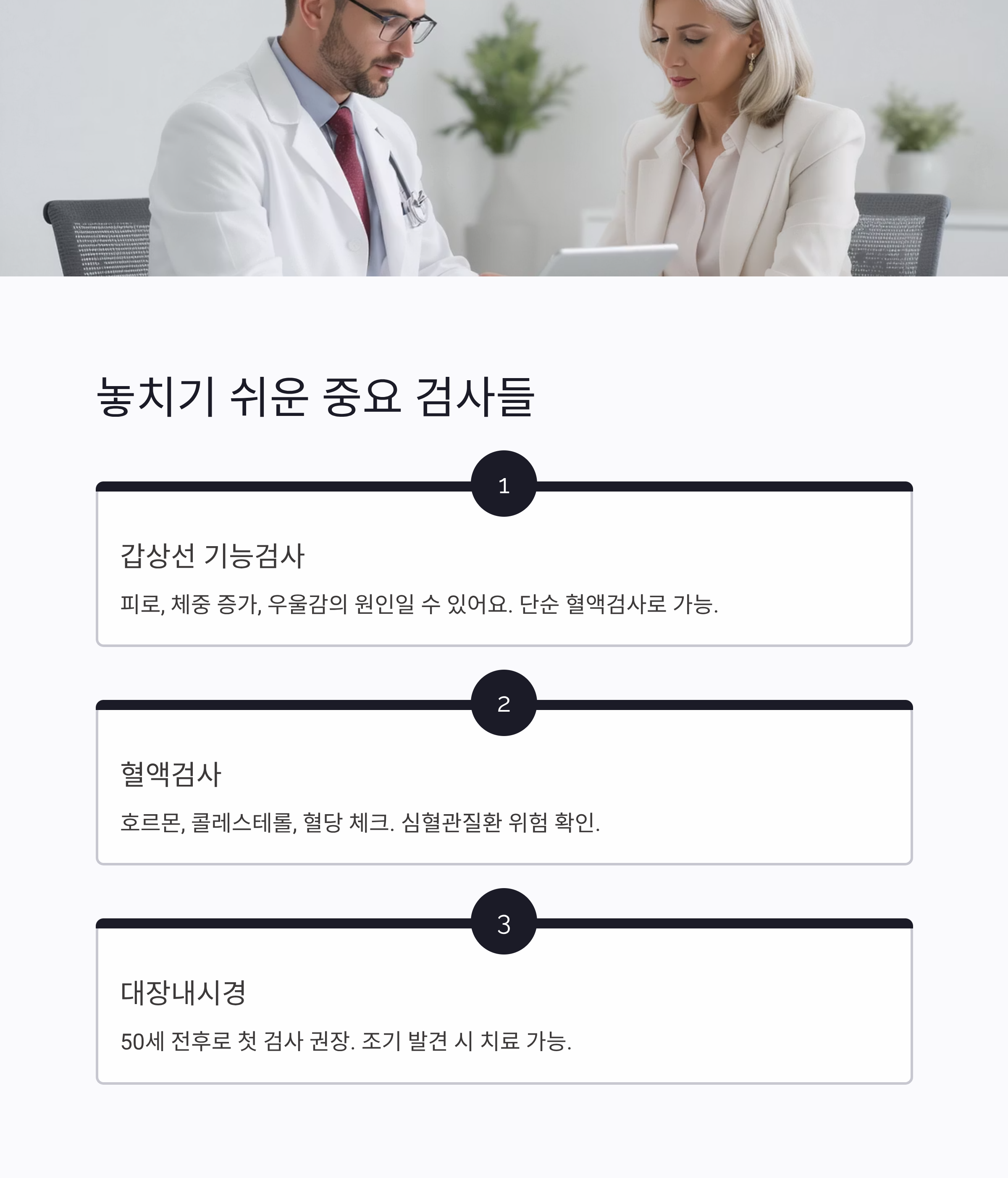 갱년기 여성에게 갑상선 이상은 꽤 흔한 일이에요. 그럼에도 불구하고 피로, 체중 증가, 무기력 같은 증상은 갱년기 탓으로만 여기고 넘기는 경우가 많죠. 하지만 저 같은 경우도, 이유 없는 졸림과 무기력함이 단순히 나이 탓이라 여겼다가 혈액검사에서 갑상선 기능저하증 진단을 받고 깜짝 놀랐답니다. 다행히 약물 치료로 금방 호전됐고요. 갑상선 기능검사는 단순한 혈액검사로 가능하며, TSH, T3, T4 수치를 통해 기능 저하 또는 항진 여부를 알 수 있어요.