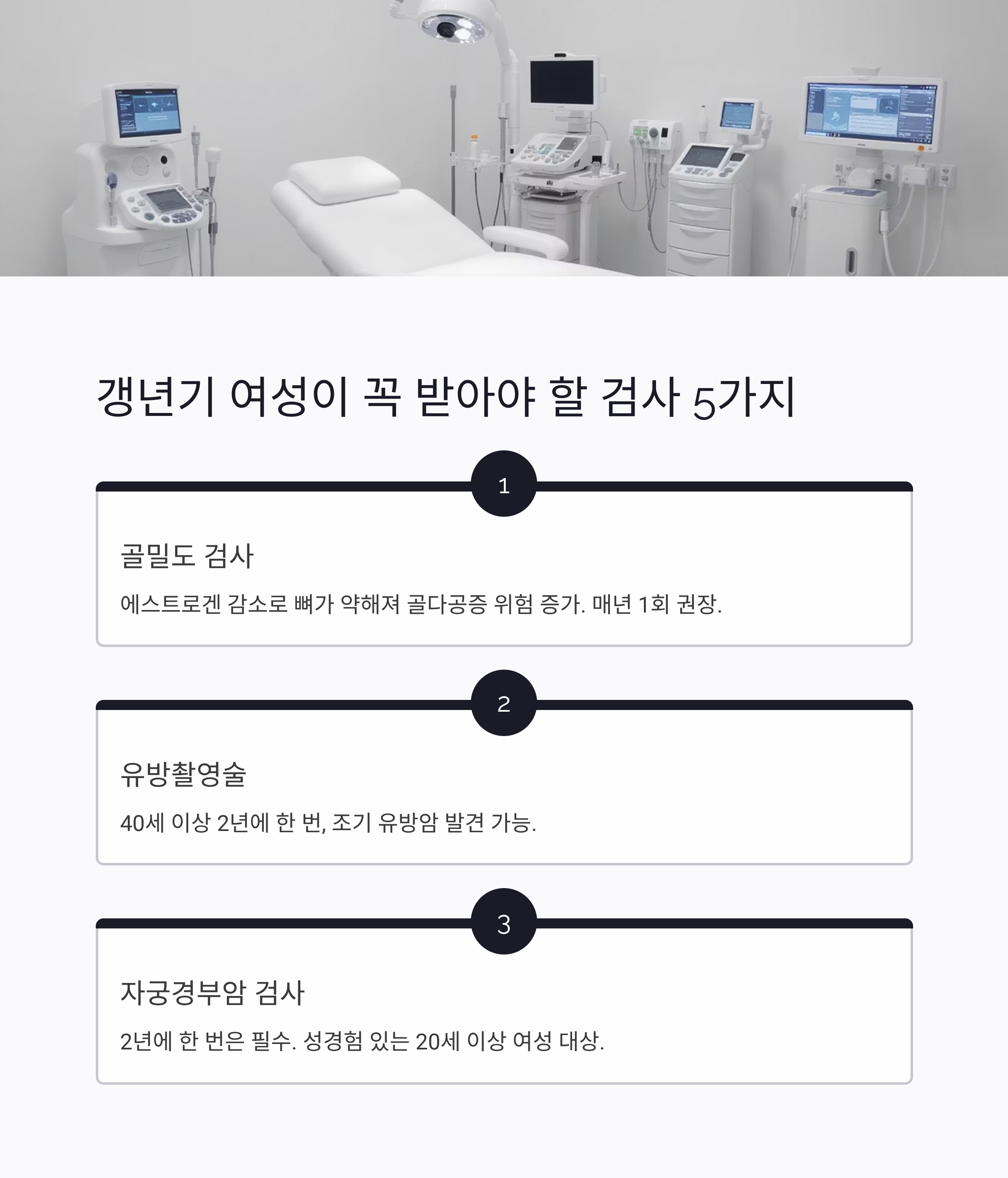 골밀도 검사와 유방촬영술이 가장 기본적이고 필수적인 검사입니다. 이후 개인의 상태에 따라 다른 검사를 병행하는 것이 좋습니다.