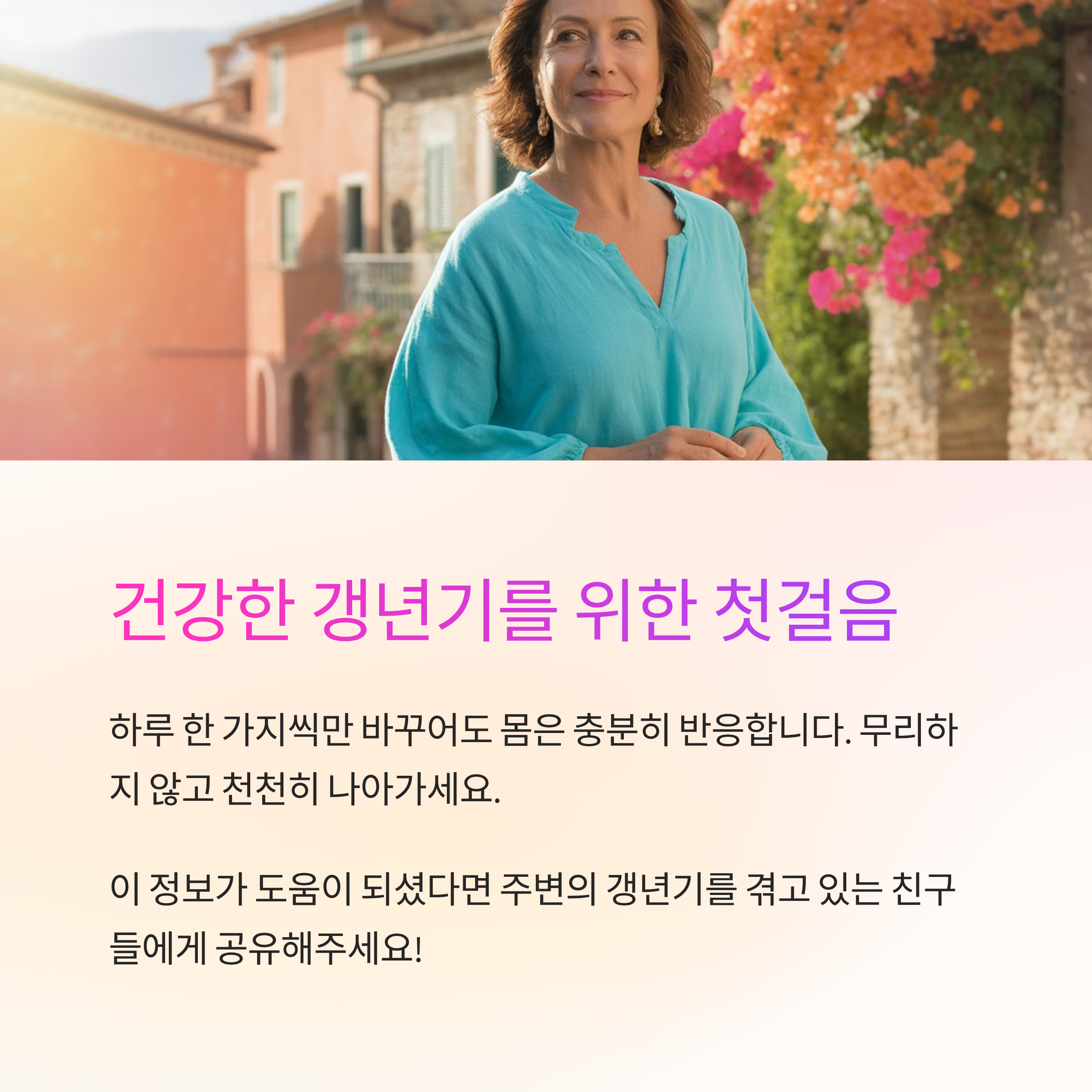 갱년기 체중 증가는 피할 수 없는 자연스러운 변화일 수도 있지만, 방치할 이유는 없습니다. 오늘 소개해드린 6가지 방법은 제가 직접 체험하며 얻은 실천 가능한 노하우입니다. 하루아침에 큰 변화는 어렵지만, 하루 한 가지씩만 바꾸어도 몸은 충분히 반응합니다. 무리하지 않고, 내 몸과 마음을 소중히 다루며 건강한 방향으로 천천히 나아가 보세요. 이 글이 여러분의 새로운 출발점이 되길 바라며, 함께 건강한 갱년기를 만들어가요!
