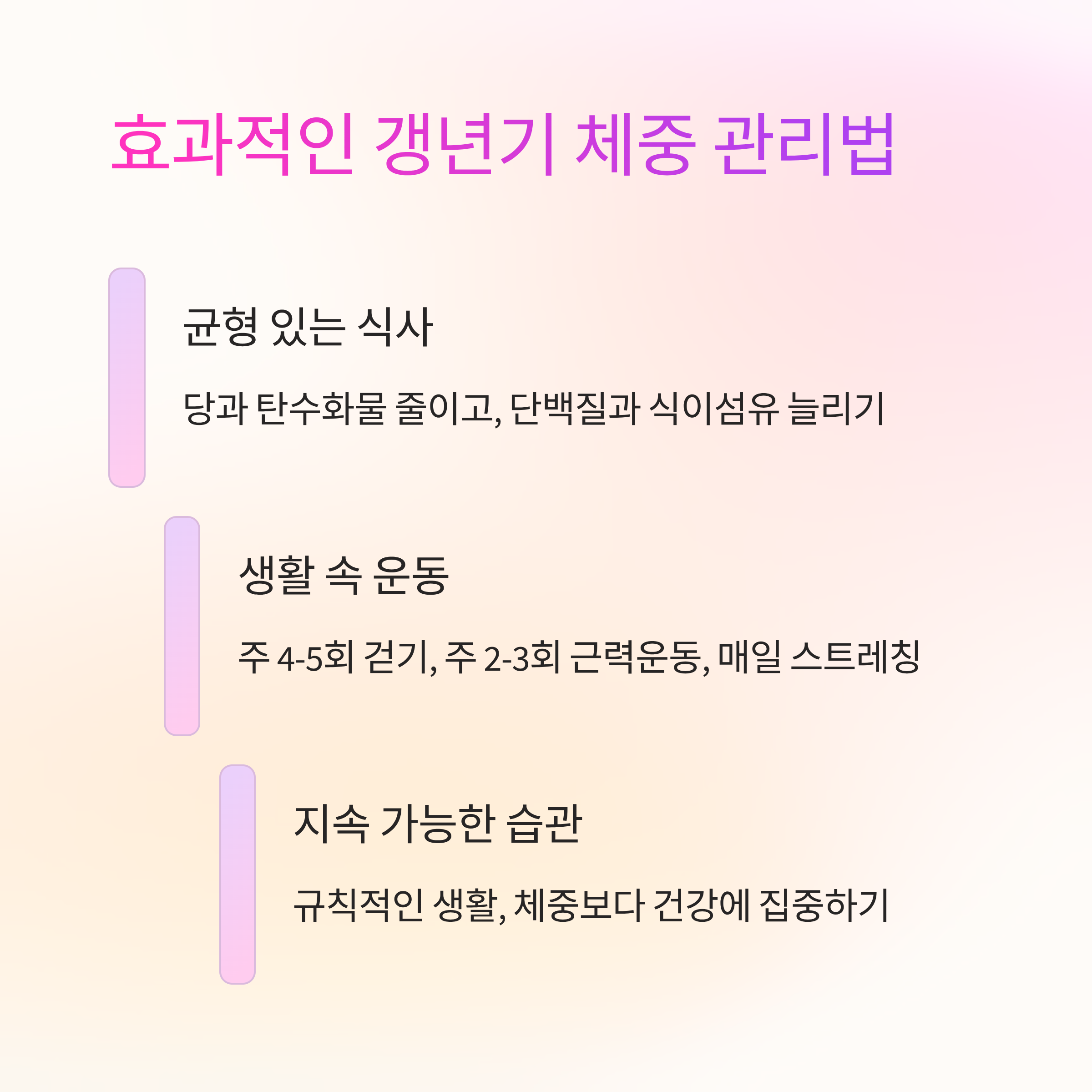 갱년기 체중 관리는 단기 다이어트로는 의미가 없습니다. 무엇보다 중요한 것은 '지속 가능한 습관'을 만드는 것이에요. 무리하지 않되, 규칙적으로 실천할 수 있는 루틴을 찾는 것이 장기적인 건강에도 도움이 됩니다. 아래는 실천 가능한 습관 전환 팁입니다.