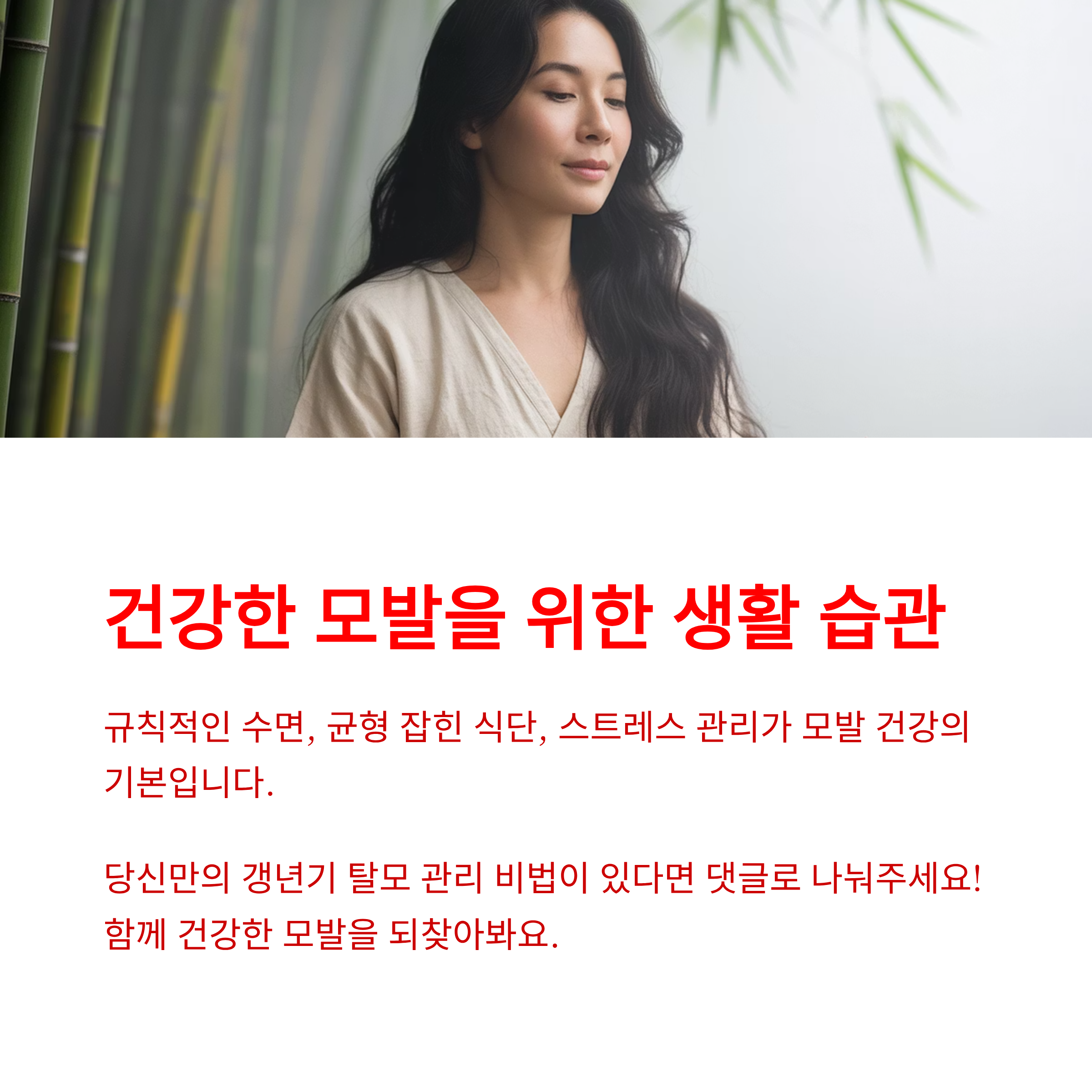 혹시 여러분만의 갱년기 탈모 관리 비법이나 실천하고 있는 건강 습관이 있다면 댓글로 나눠주세요. 서로의 경험이 누군가에겐 큰 힘이 될 수 있습니다.