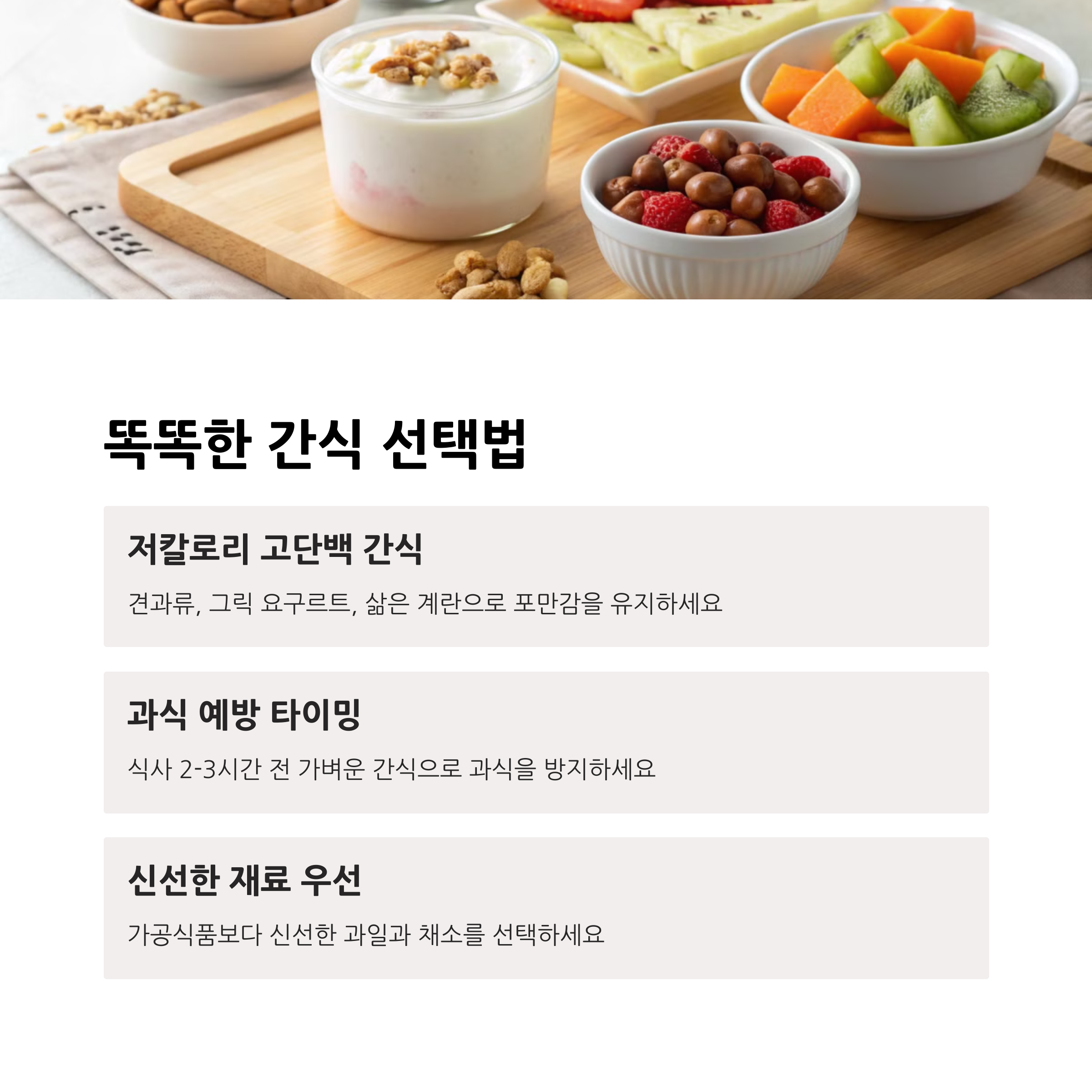 | 필요한 모든 영양소를 고루 섭취 | 하루 세 끼 일정 시간에 섭취 | 저칼로리, 고단백 간식 |