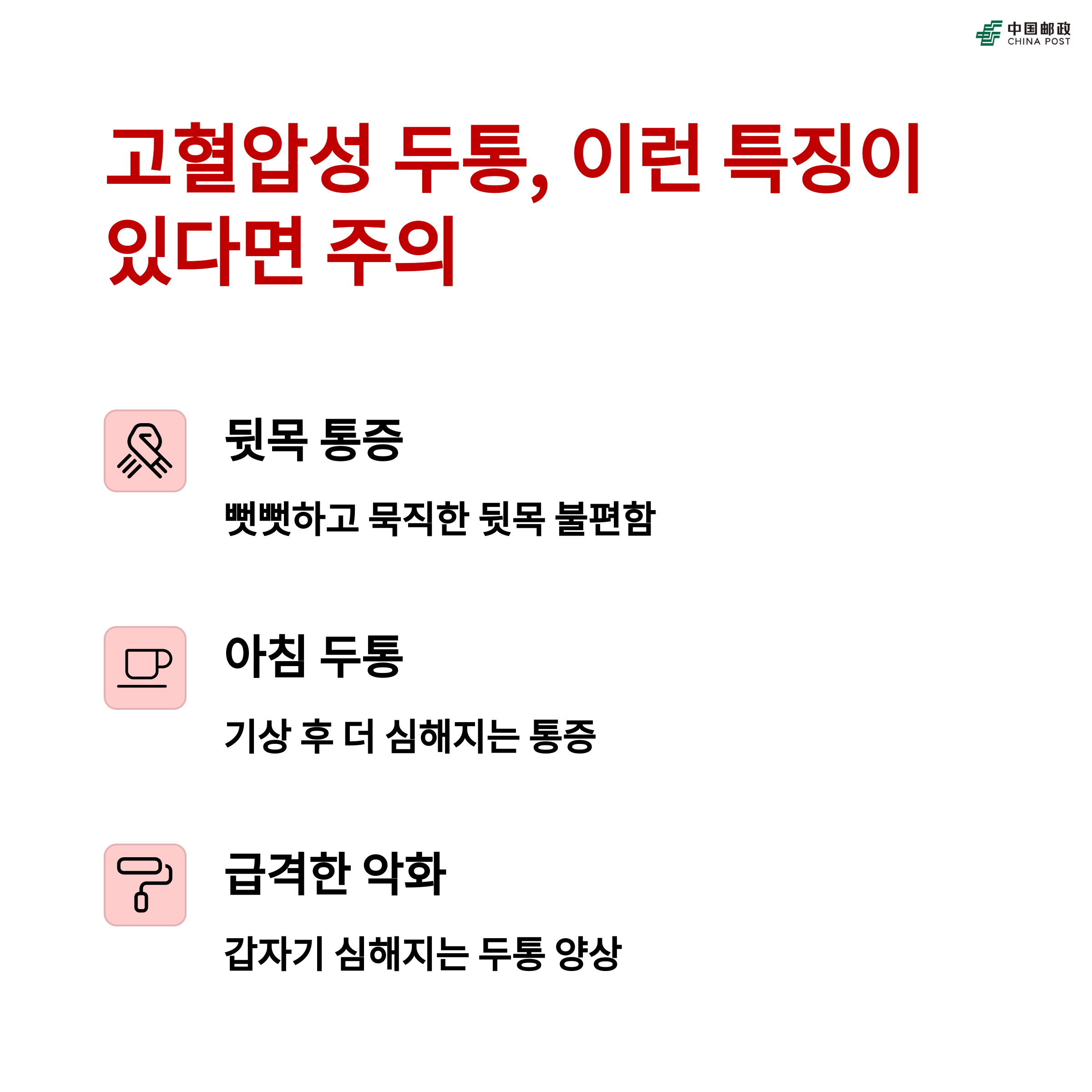 고혈압 관련 두통이 있다고 해서 무조건 병원에 갈 필요는 없지만, 다음과 같은 증상이 함께 나타난다면 바로 병원을 찾아야 해요.