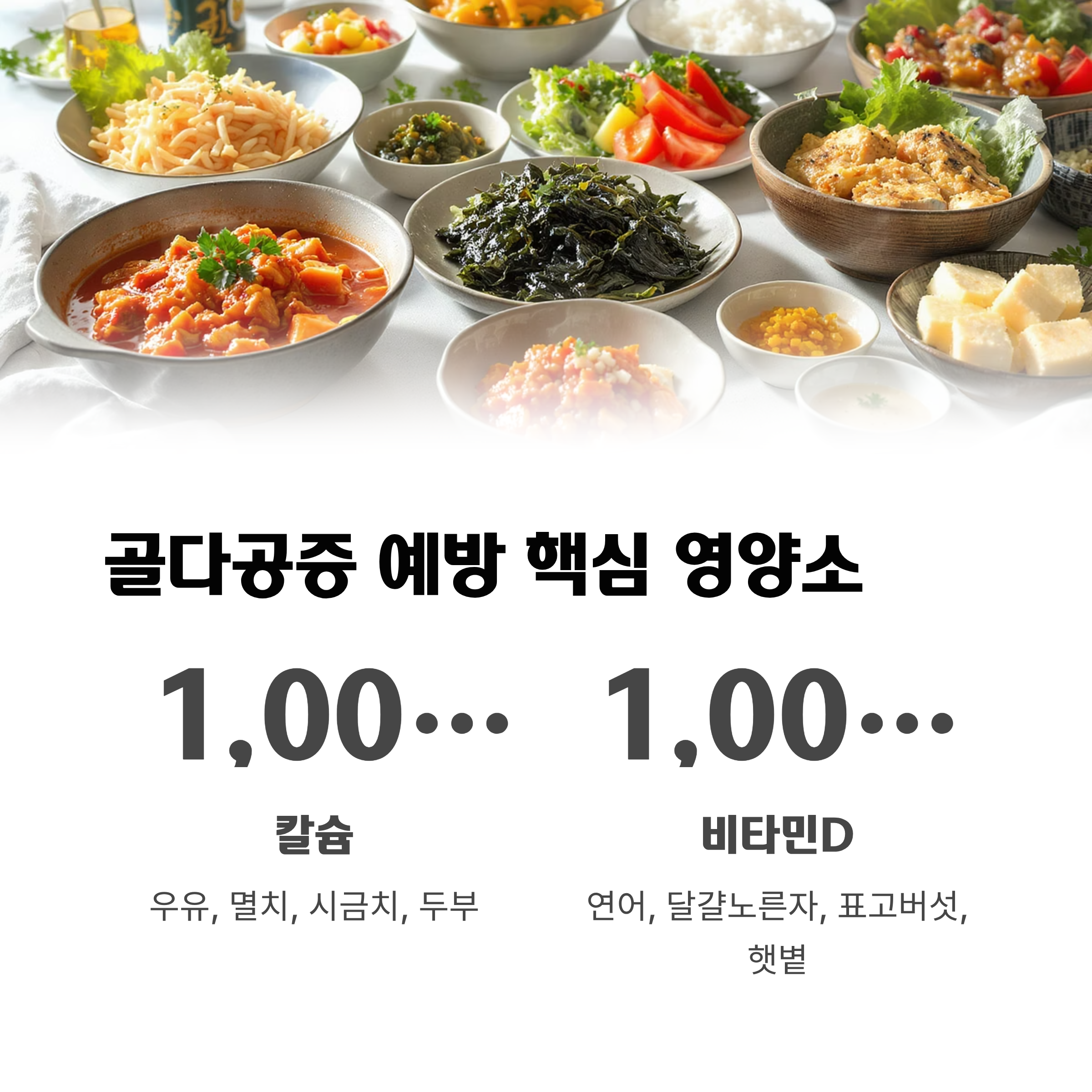 칼슘과 비타민D는 골다공증 예방에 가장 핵심이 되는 영양소예요. 그런데 생각보다 많은 분들이 이 두 가지를 충분히 섭취하지 못하고 있어요. 하루 권장량이 얼마인지, 음식으로 얼마나 섭취할 수 있는지를 표로 정리해 봤어요.