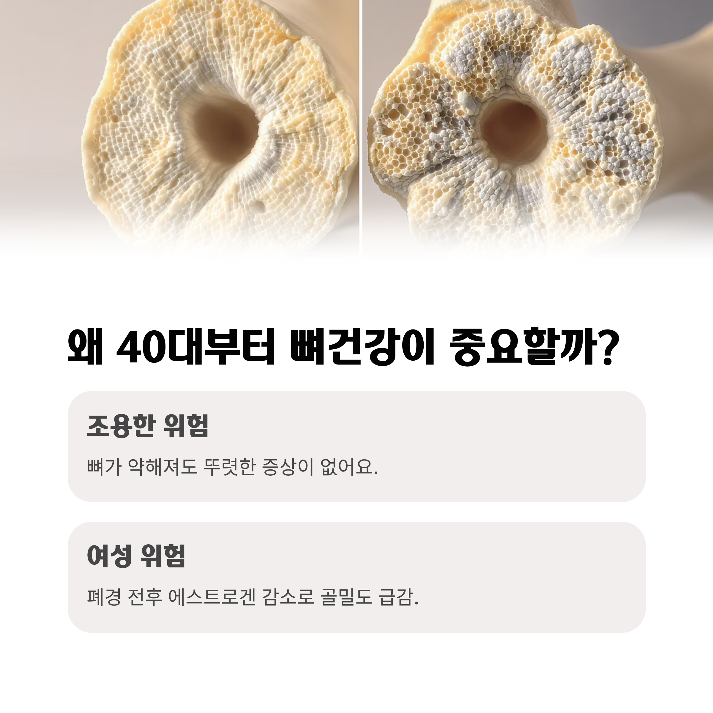 뼈는 우리 몸의 기둥이에요. 그런데 이 기둥은 나이가 들면서 조금씩, 그리고 아주 조용히 약해집니다. 특히 여성은 폐경을 전후로 에스트로겐 분비가 급격히 줄어들기 때문에 골밀도가 빠르게 낮아지게 되죠. 40대부터 이미 골다공증이 시작되는 분들도 많아요. 그런데 문제는 뼈가 약해져도 뚜렷한 증상이 없다는 거예요. 그래서 뼈 건강을 챙기지 않으면 어느 날 갑작스럽게 골절을 당하고 나서야 심각성을 깨닫게 되죠. 그러니 지금, 뼈가 아프지 않을 때 예방을 시작해야 해요.