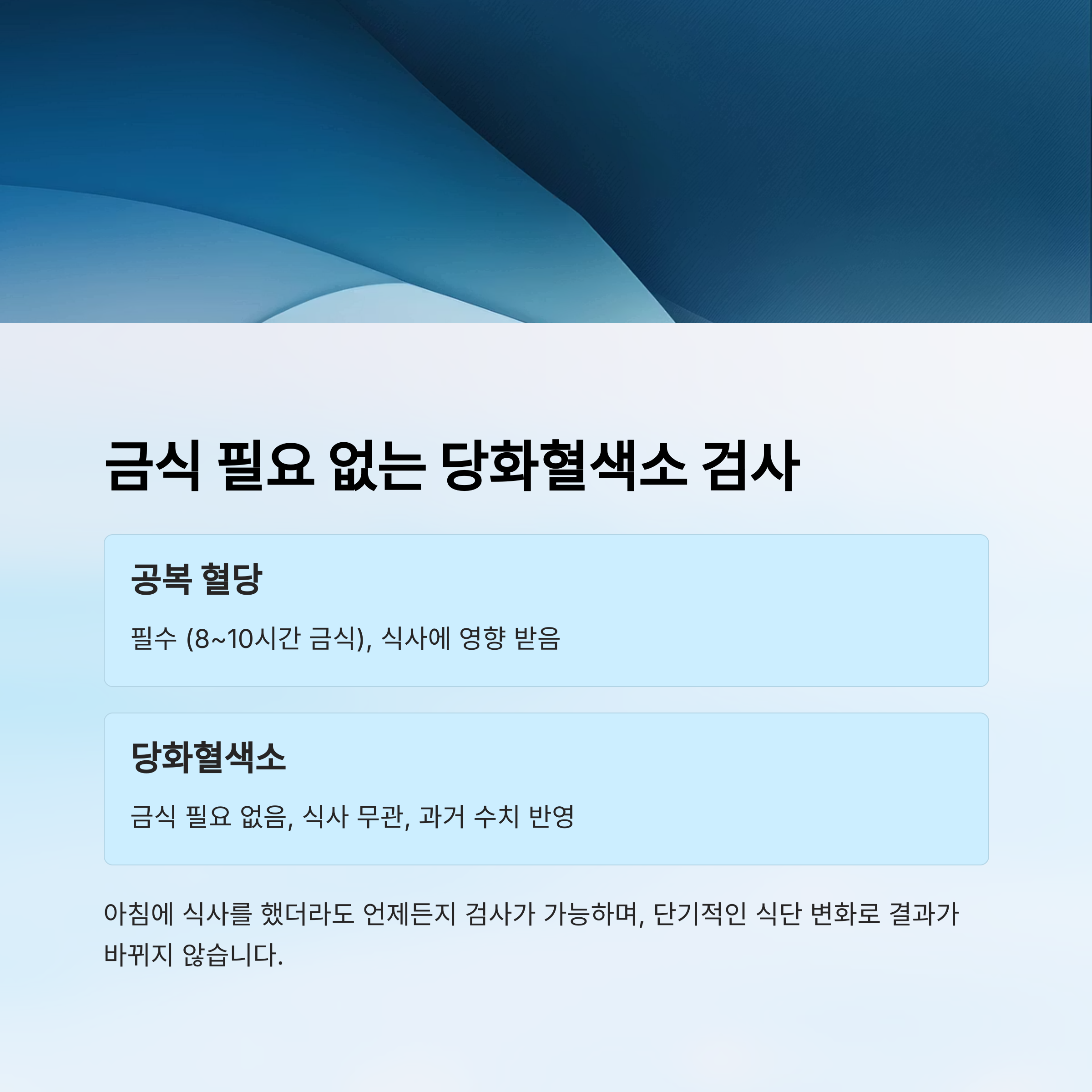 | 당화혈색소 | 필요 없음 | 식사 무관, 과거 수치 반영 |