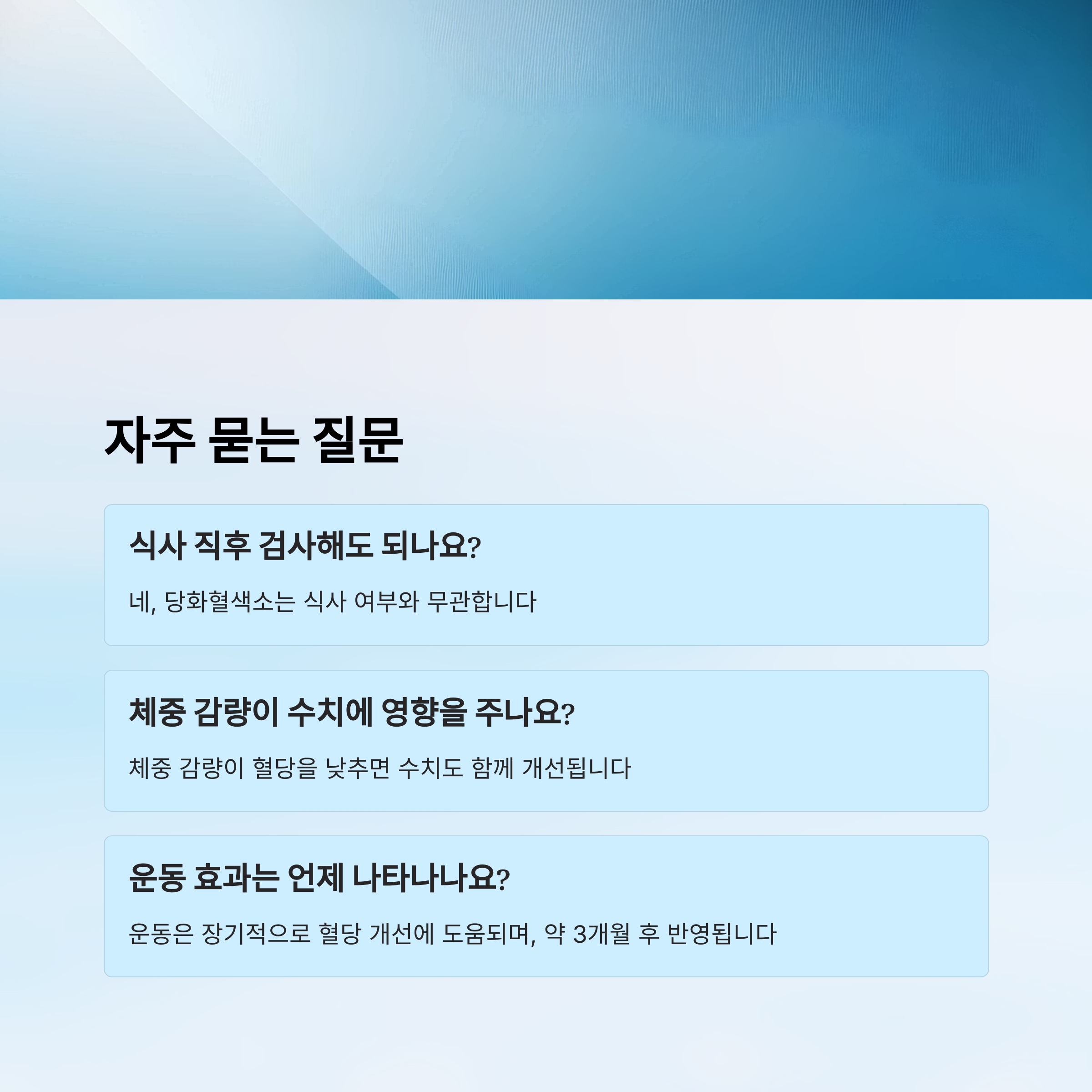 | 운동하면 당화혈색소도 바로 낮아지나요? | 운동은 장기적으로 혈당 개선에 도움되며, 수치는 약 3개월 후 반영 |