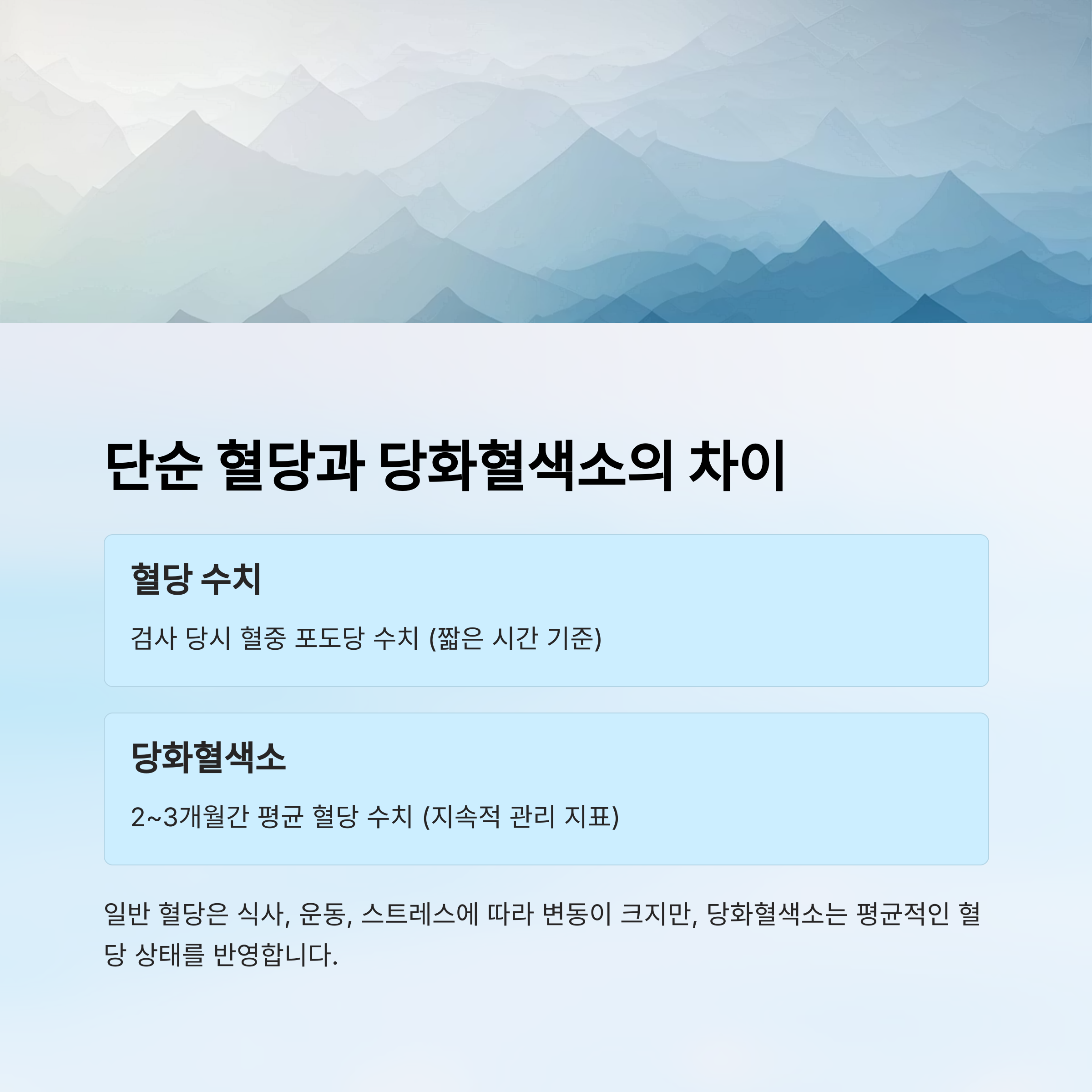 | 당화혈색소 | 2~3개월간 평균 혈당 수치 (지속적 관리 지표) |