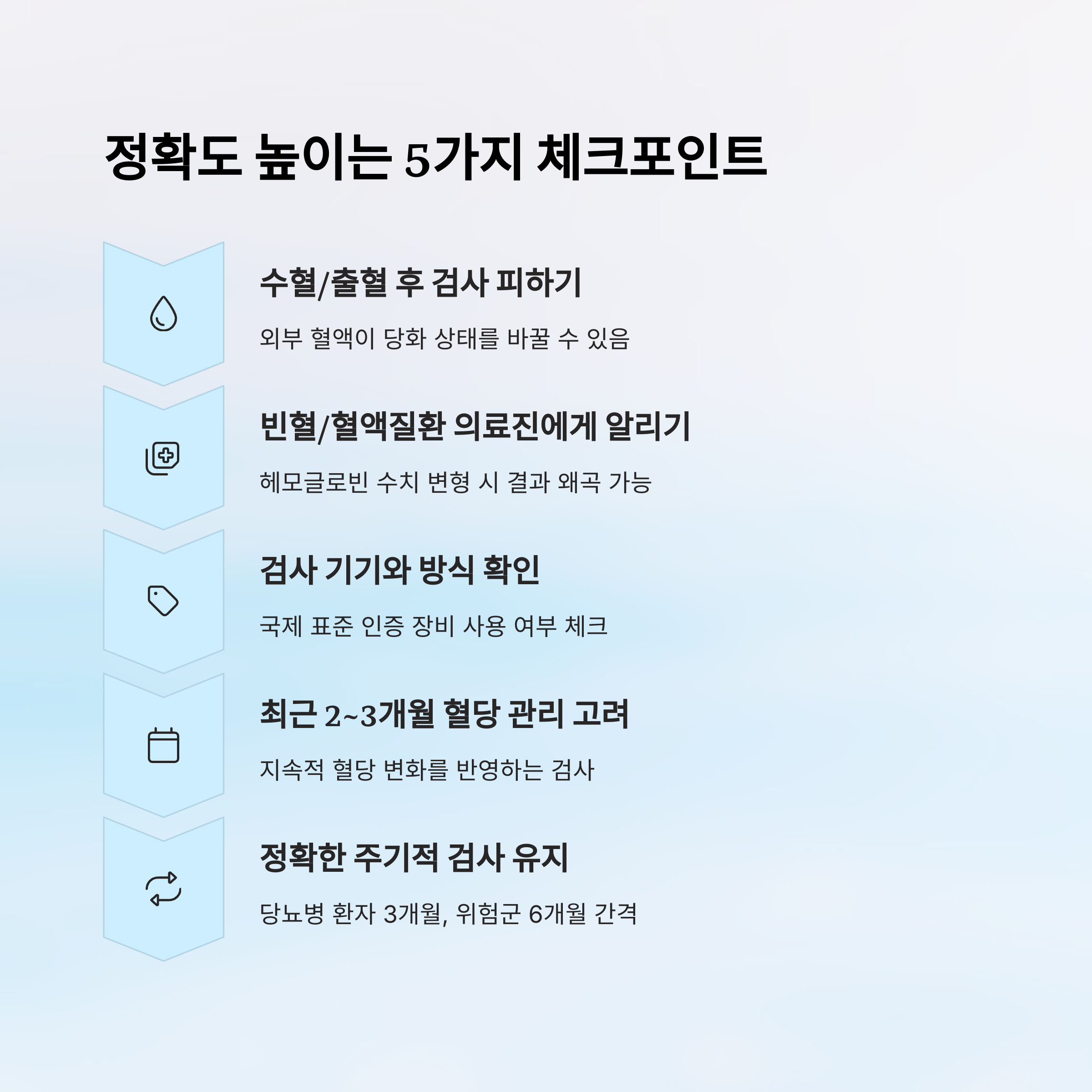 정확한 당화혈색소 수치를 얻기 위해 아래 사항을 고려해야 합니다.