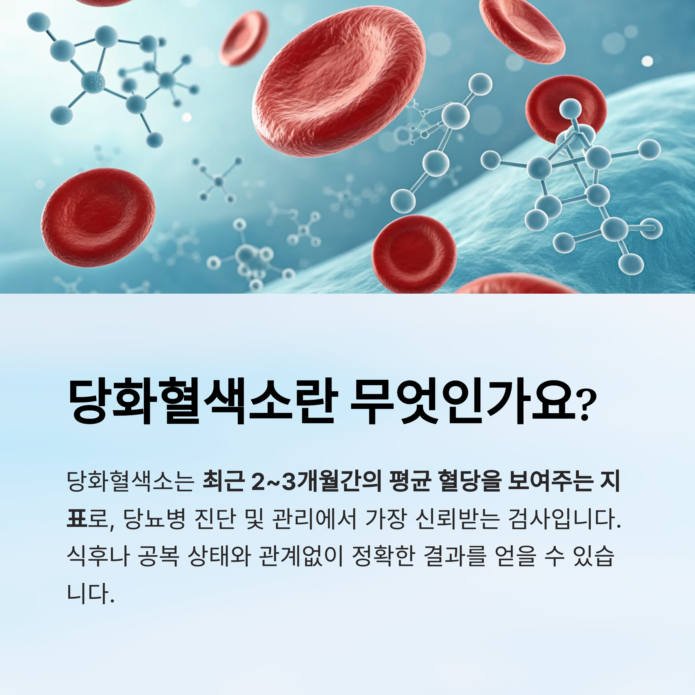 당화혈색소(HbA1c)는 혈액 내 포도당이 적혈구의 헤모글로빈과 결합된 상태를 측정한 수치입니다.