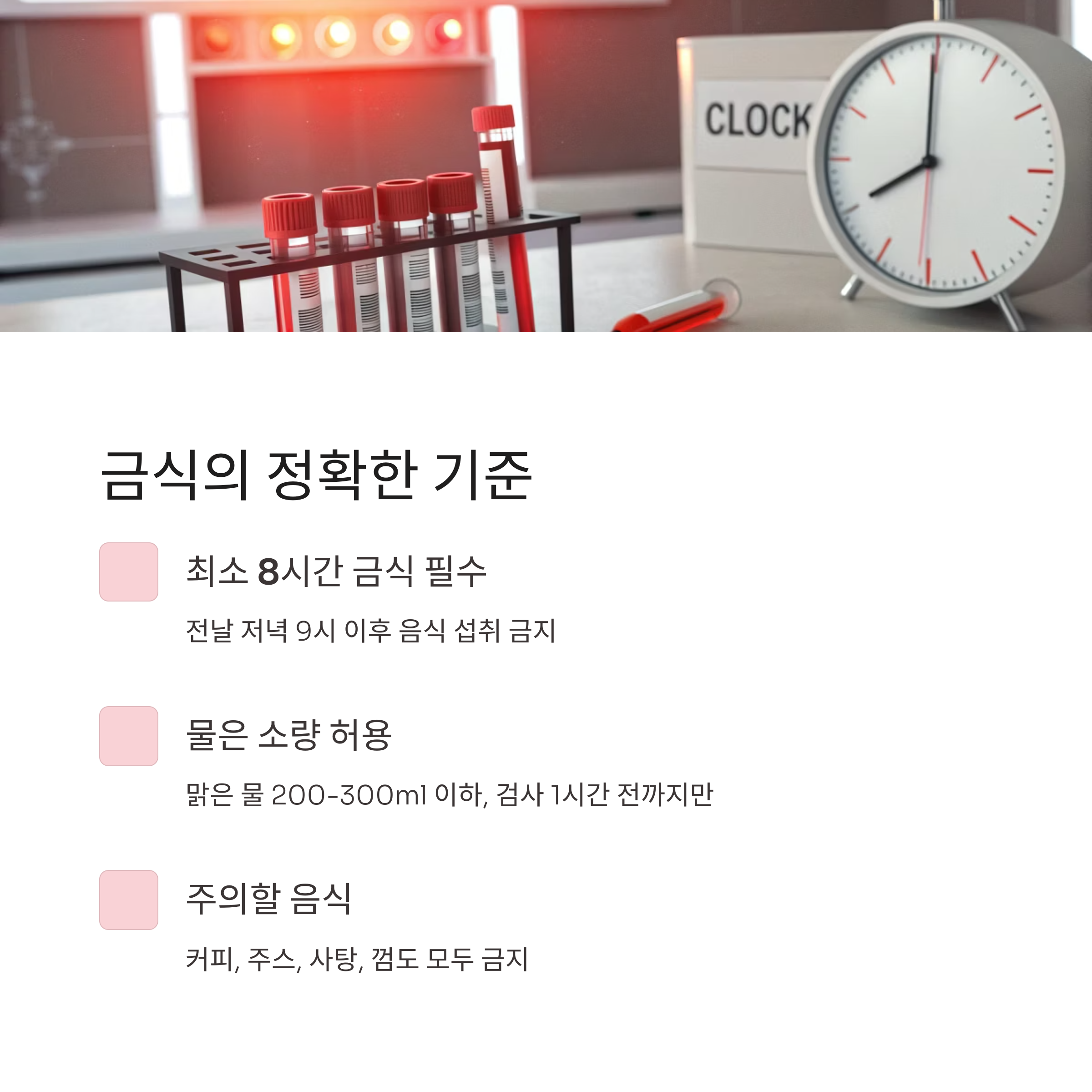 - 과일이나 주스도 금식 시간 중 섭취 금지