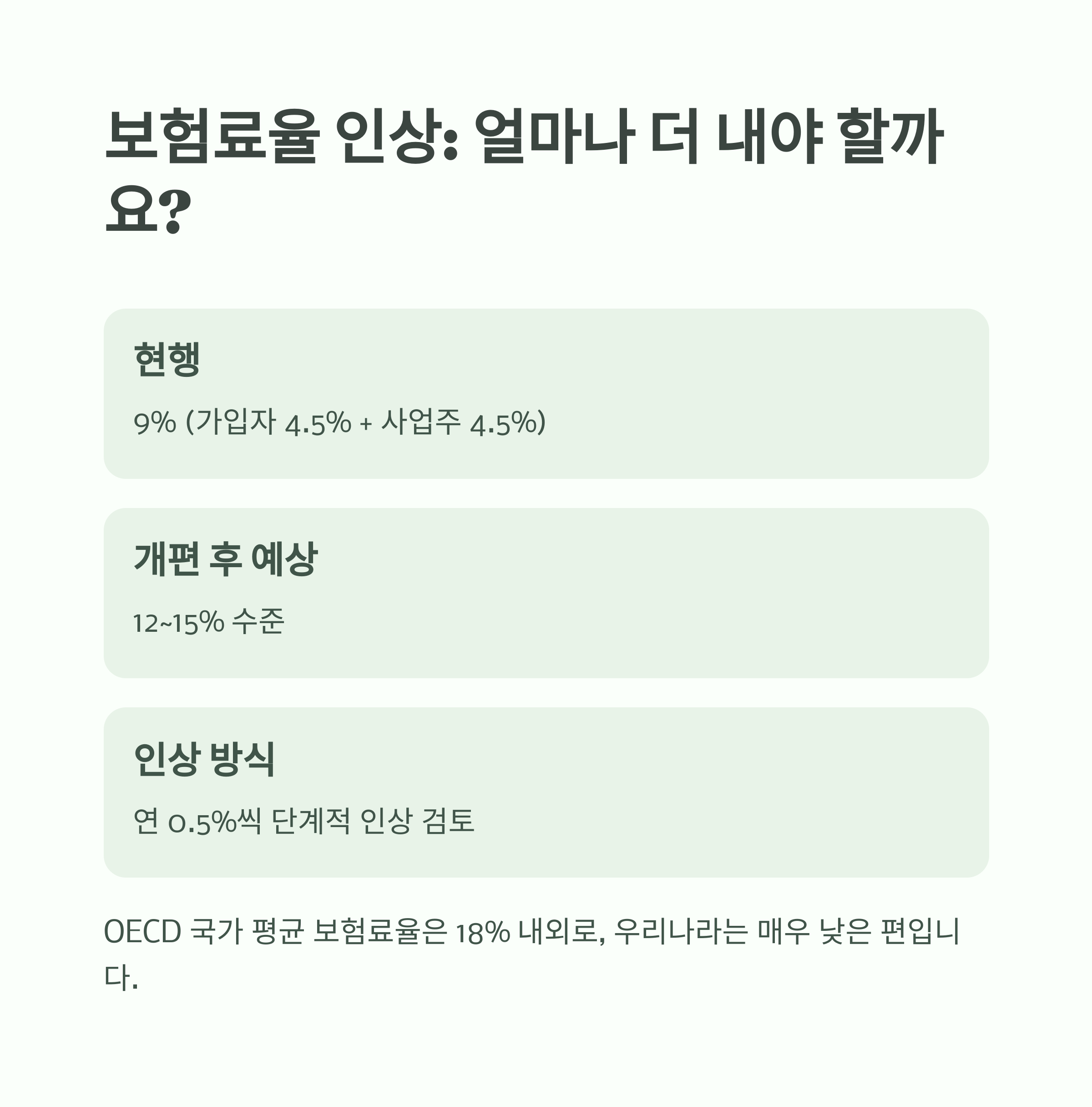하지만 OECD 국가 평균 보험료율은 18% 내외로, 우리나라의 수준은 매우 낮은 편에 속합니다.