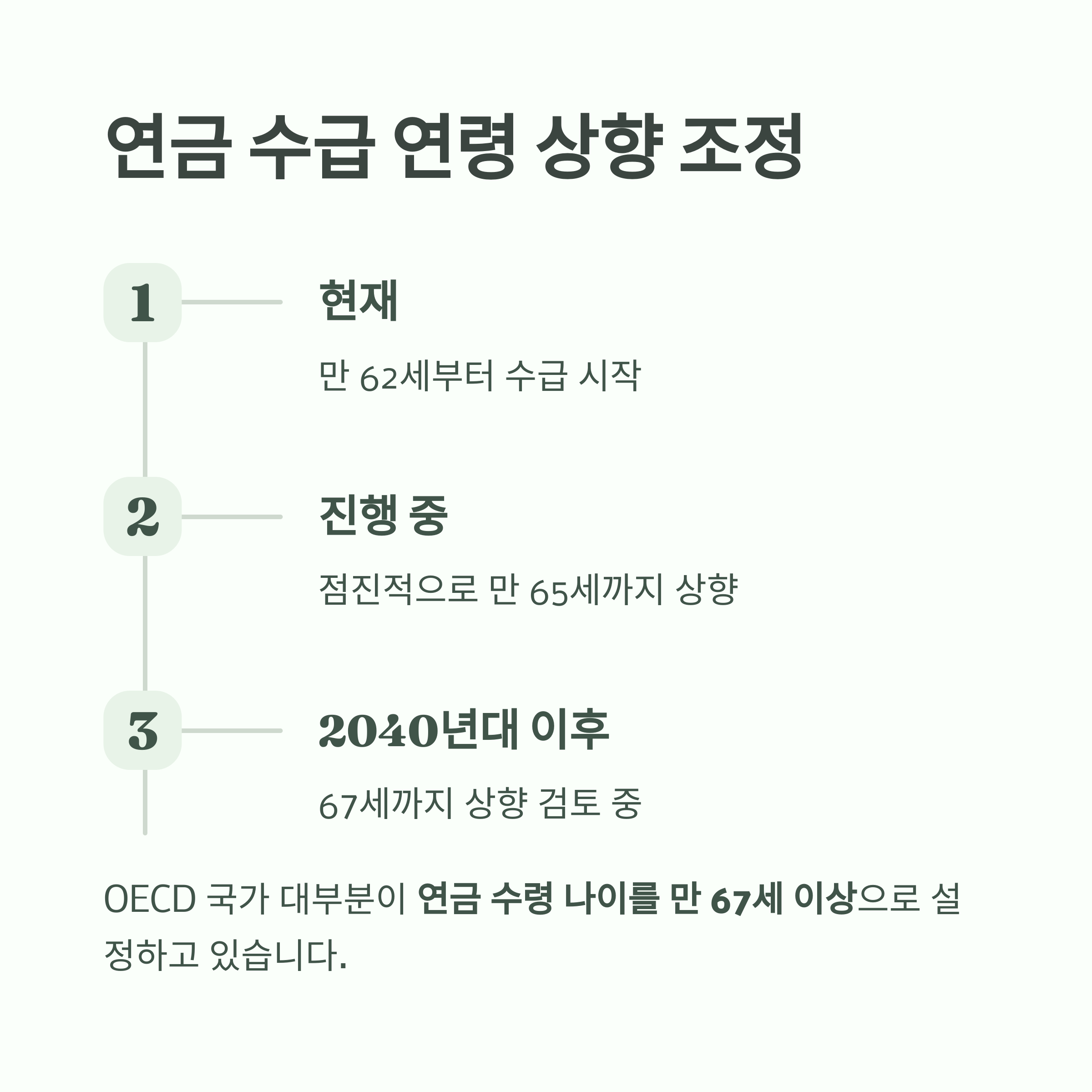 우리나라 역시 2040년대 이후 수급 개시 연령을 67세까지 상향하는 안이 유력하게 검토 중입니다.