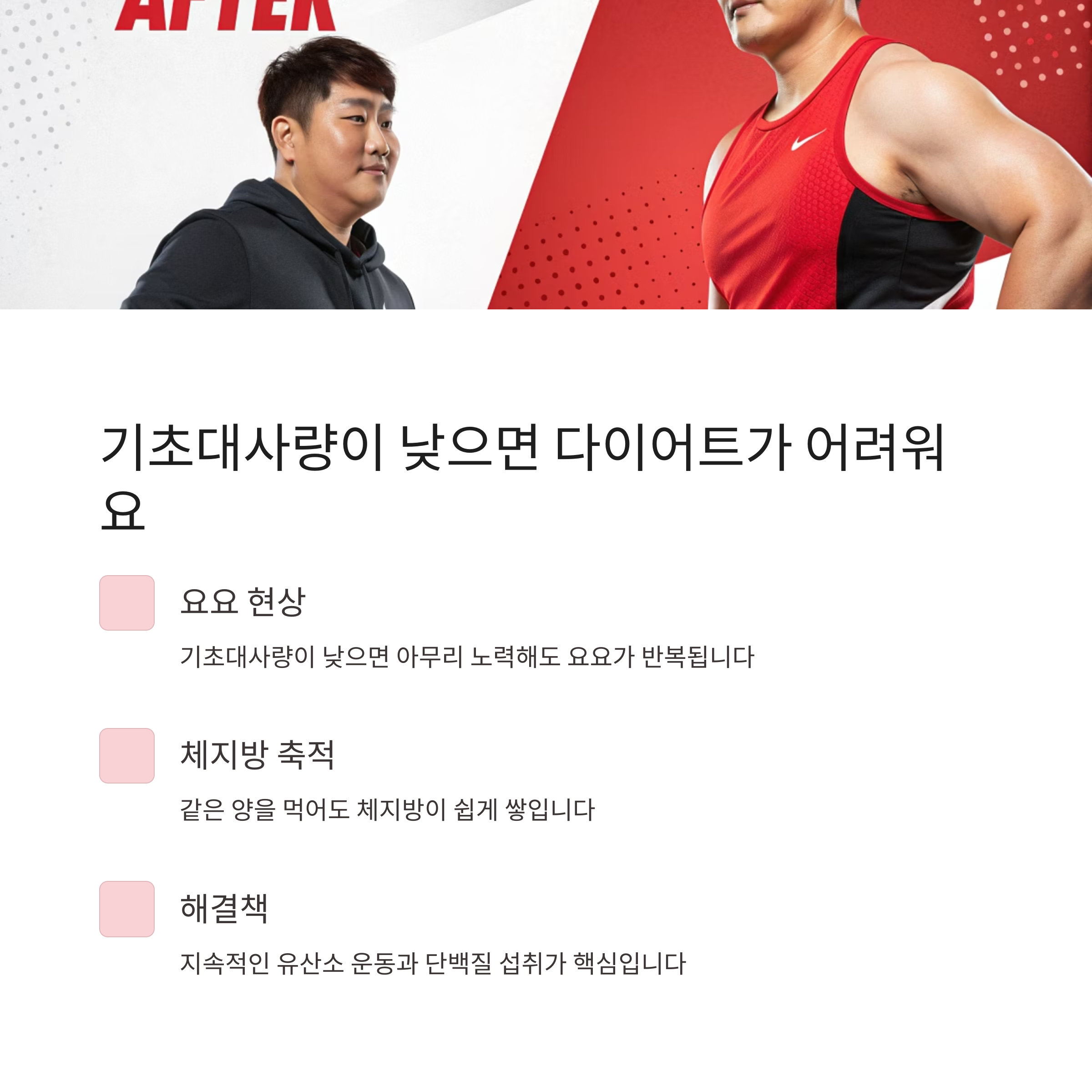기초대사량은 선천적인 체질이 아니라, 후천적인 관리로 충분히 높일 수 있는 요소입니다.