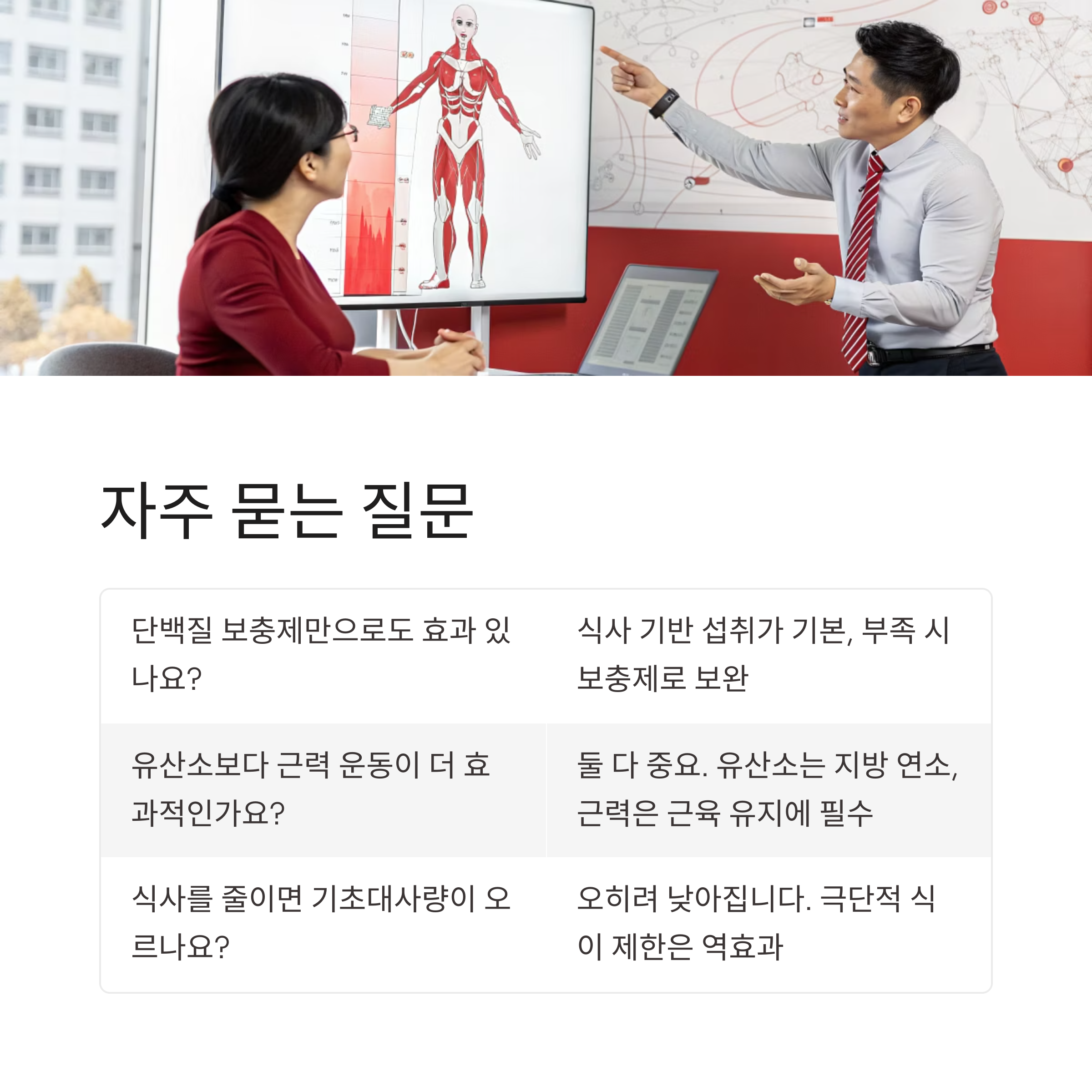 | 단백질 보충제만으로도 효과 있나요? | 식사 기반 섭취가 기본이며, 부족한 경우 보충제로 보완 |