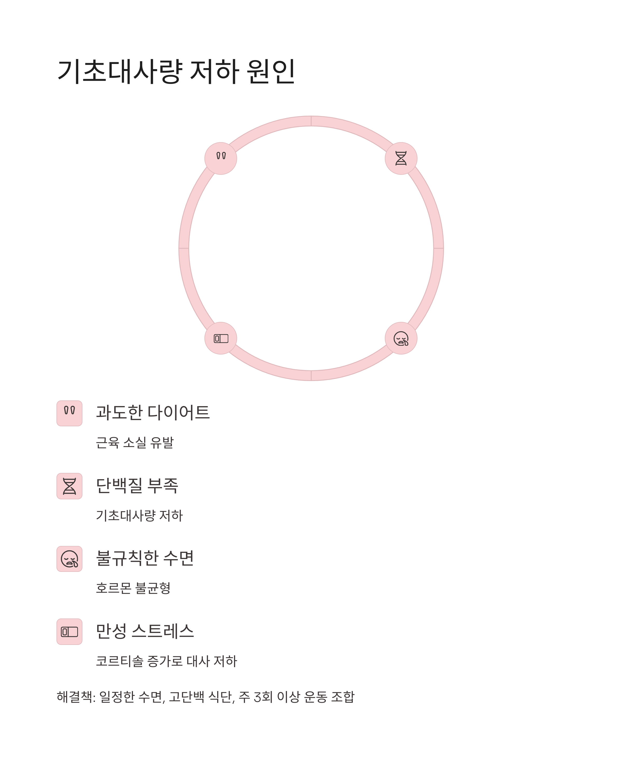해결책: 매일 일정한 수면, 고단백 식단, 주 3회 이상 유산소+근력 운동 조합이 필요합니다.