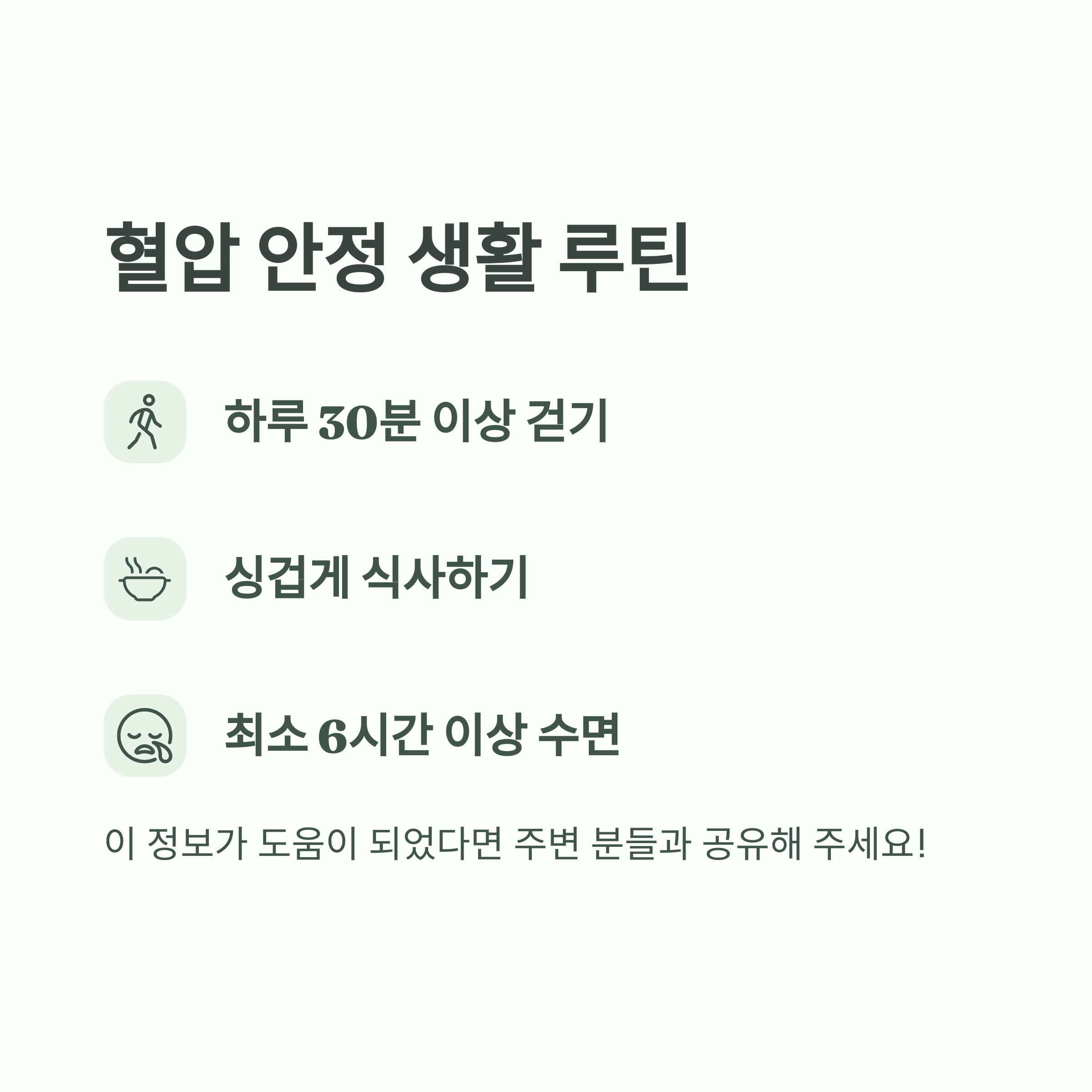 혈압은 일상의 사소한 습관에서부터 크게 영향을 받습니다. 아래 리스트는 누구나 쉽게 실천할 수 있는 혈압 안정 루틴입니다.