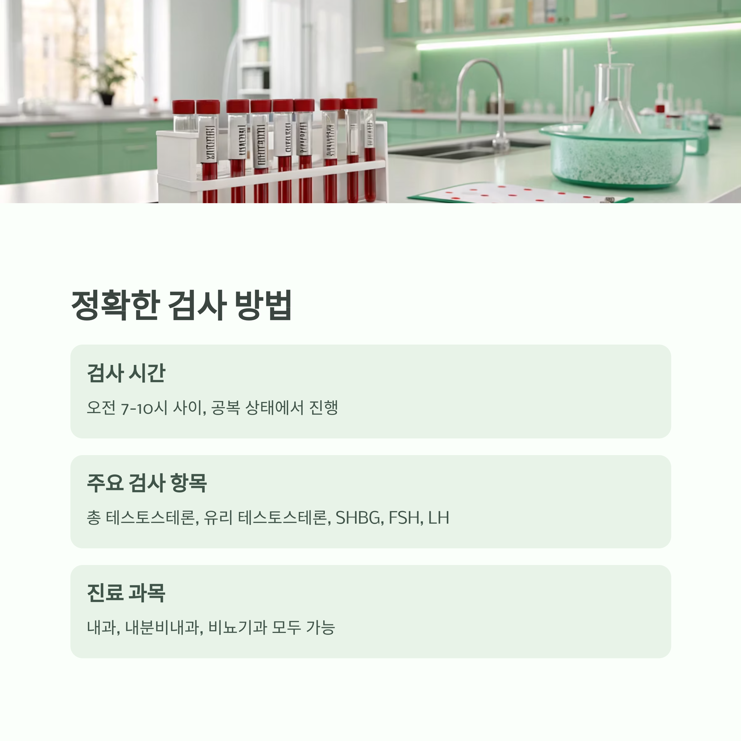 남성호르몬 수치를 확인하는 가장 정확한 방법은 혈액검사입니다. 검사 시간은 오전 7시에서 10시 사이가 가장 적절하며, 공복 상태에서 진행하는 것이 좋습니다. 일반적으로 다음과 같은 항목들이 포함됩니다.
