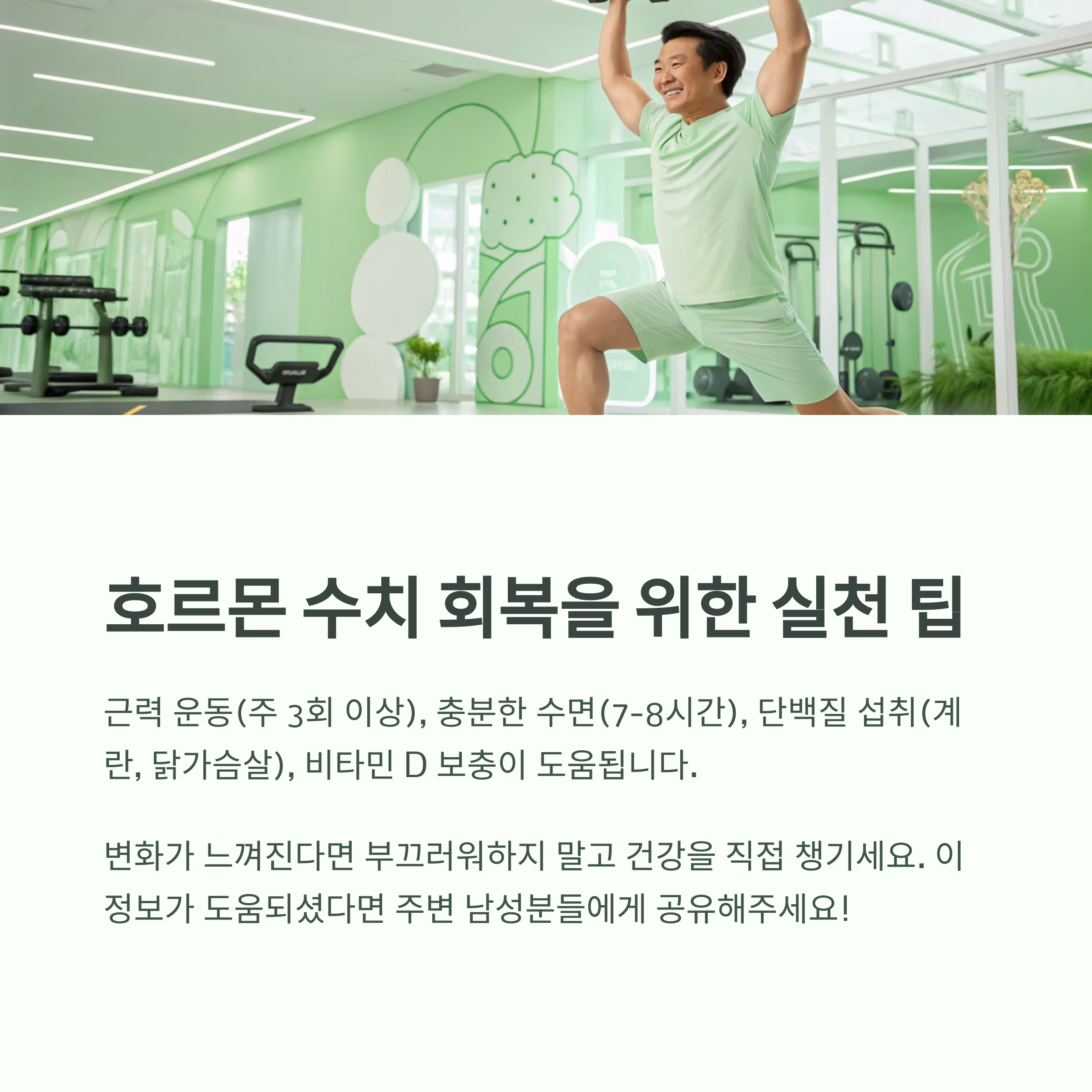 - 남성호르몬 수치는 나이에 따라 무조건 줄어드나요? → 30대 이후 서서히 감소하지만, 관리에 따라 유지 가능합니다.