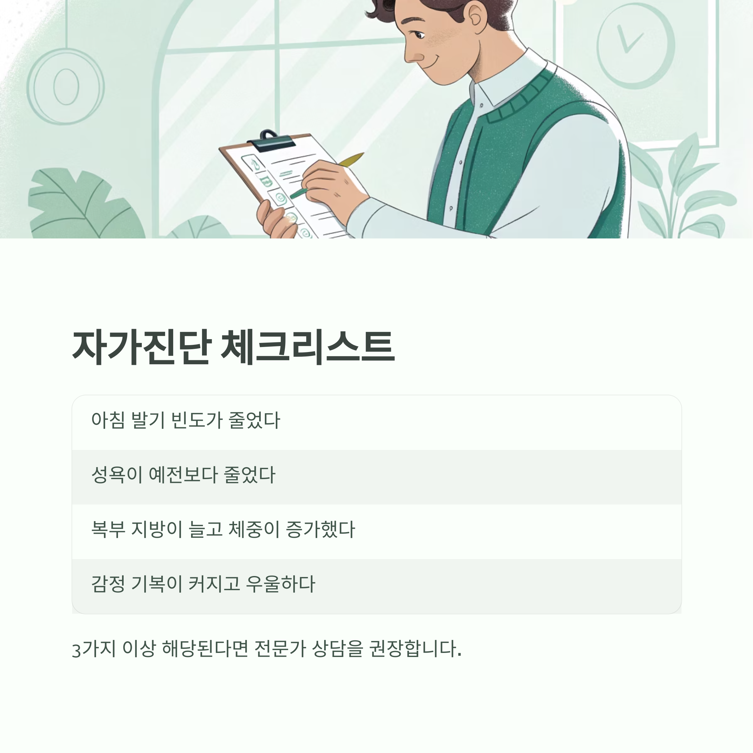 몸이 예전 같지 않고, 자꾸 피곤하고 의욕이 떨어지시나요? 혹시 남성호르몬 수치가 낮아진 건 아닌지 걱정되신다면, 지금 이 글이 꼭 필요합니다. 불안함을 덜어줄 수 있는 5단계 검사 및 진료 가이드를 소개합니다.