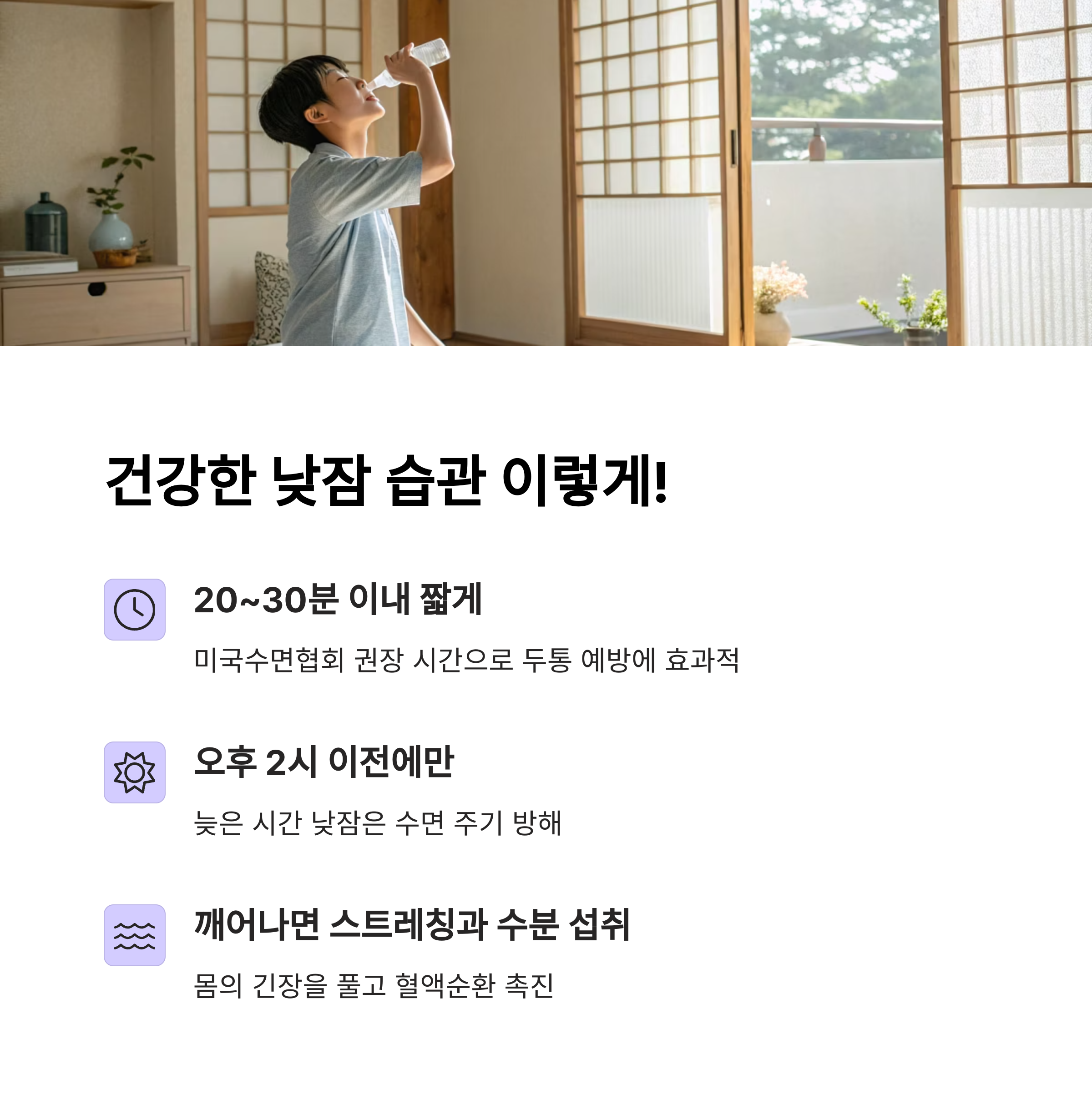 - 정해진 시간: 매일 같은 시간에 낮잠을 자도록 하여, 몸의 수면 리듬을 일정하게 유지하세요.